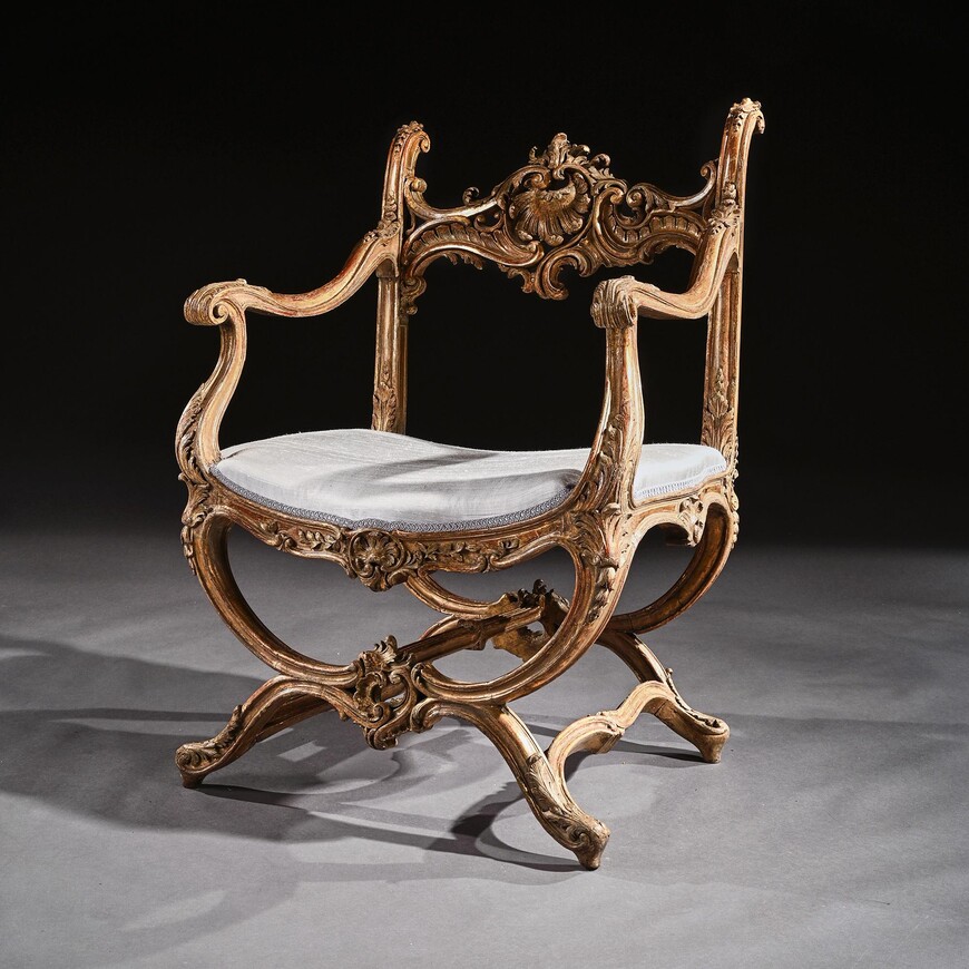 Of mid 19th century date and made in Venice we have an attractive saddle-seated curule form or x- framed armchair executed entirely in giltwood with profuse rococo-style carved detailing