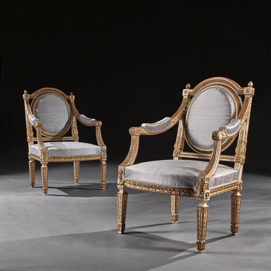 In the neoclassical manner, we have a fine pair of painted and parcel gilt armchairs that were made in Italy c.1880