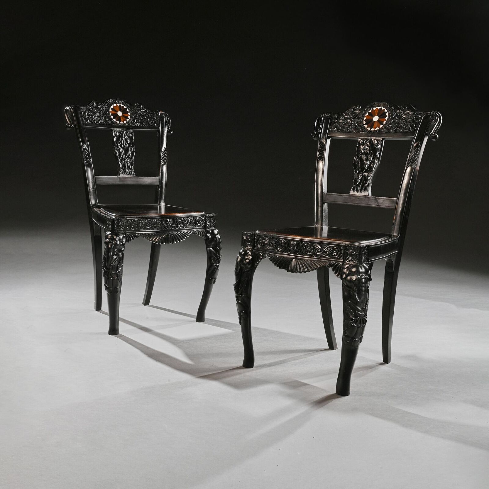 These chairs are Ceylonese, made in the Galle district, and from the mid 19th century c.1840. They are primarily made from highly carved and lustrous ebony with elephant face and trunk form front legs. There is further carving to the rails, including a drop-carved cabochon apron, and a beautiful back splat with fine leaf carving. In the centre of the head rails are inlaid paterae consisting of native specimen woods from Ceylon set inside an ivory border. These chairs were inspired by European designs but executed in Asia for export and were highly sought after when made. They remain just as desirable today. They are highly decorative and a great cross-cultural fusion of skills and designs.