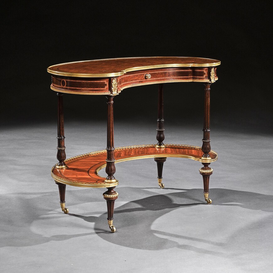 Kidney-shaped pieces are associated with Gillows-the firm produced a large number of desks in this shape which are eagerly contested whenever they appear for sale. Indeed there are many dealers in purely 18th century furniture who will bend their rules and purchase these pieces when they become available, such is the quality and decorative appeal. The fine dealers Apter-Fredericks had many of them during their time trading for example.