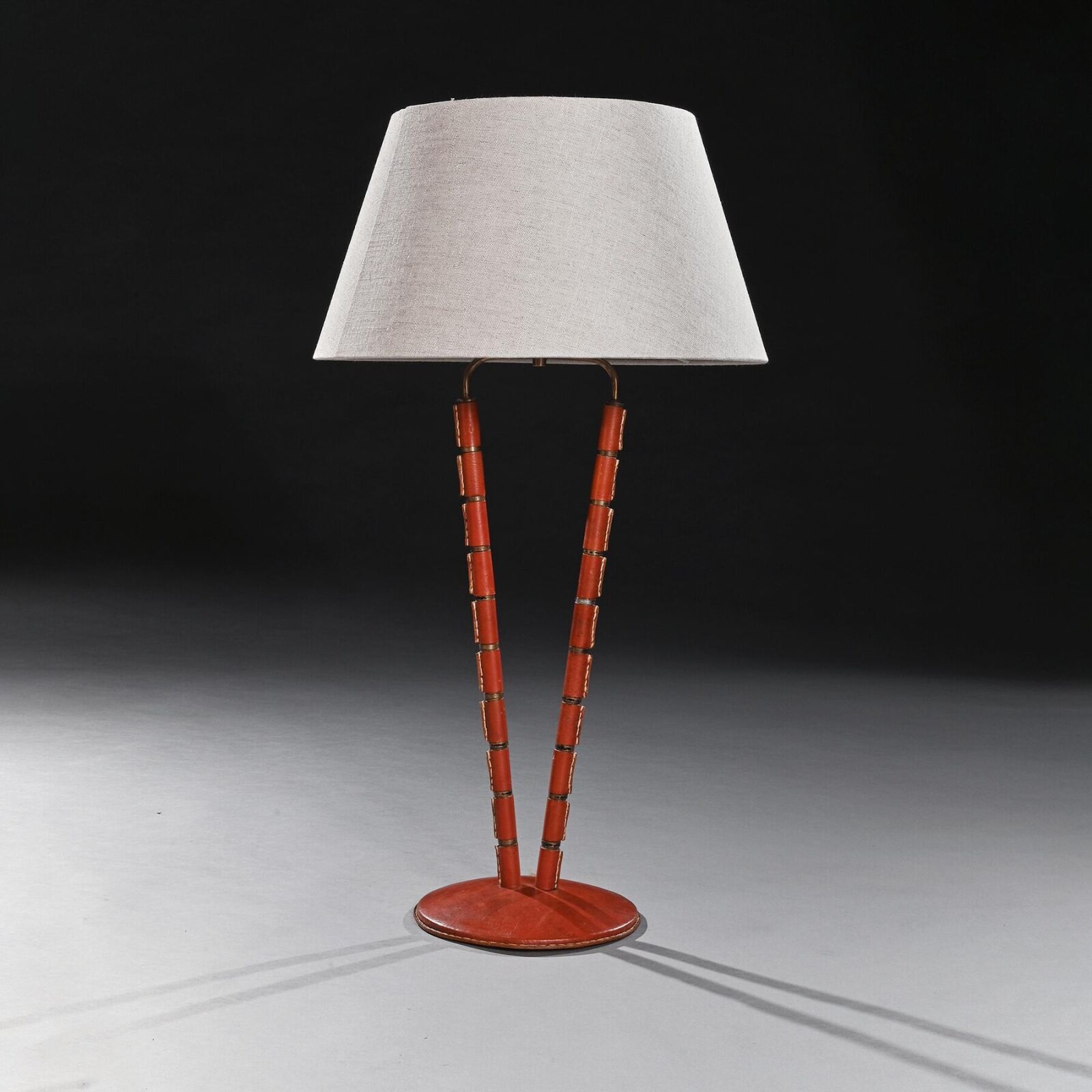The materials used are largely the same-brass in this case covered in red leather and, again, the chinoiserie style makes an appearance in the form of two bamboo canes which converge at the base and support the shade at the other end. The single stemmed version of this design is perhaps Adnet's most famous lighting design and this twin stemmed version is much rarer and has not been as widely reproduced in the 21st century, making it all the more unusual and interesting. The quality of the Adnet workshop's materials and finishing is highly evident here and, again, this piece survives in excellent original condition. This lamp presents an opportunity to acquire a notable piece of 20 th century design and perhaps begin a collection of pieces from this fine designer and his workshop.