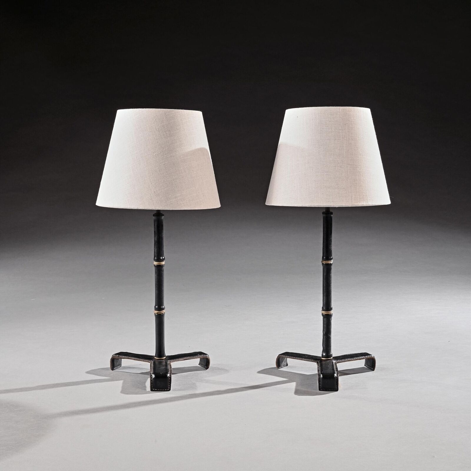 In our current collection we have three table lamps attributed to Adnet, one pair and one single, all designed around 1955 and all incorporating hand stitched leather covers over a metal frame.
