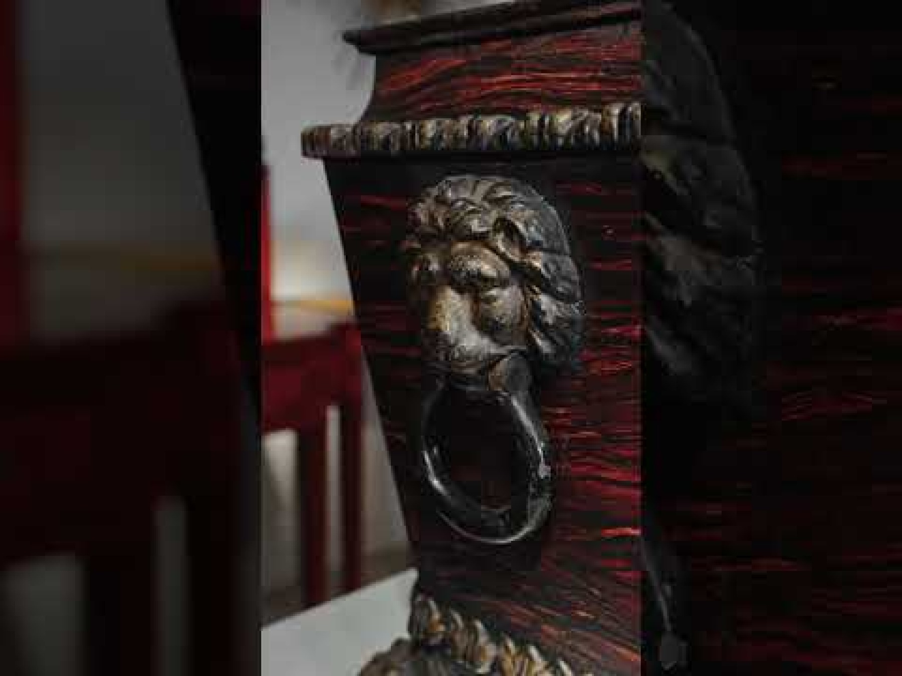 Painted to simulate palisander wood and with parcel-gilt, the cavetto-moulded hinged lids cast with flower sprays above foliate-cast bands over front panels relieved with river gods within canted corners cast with standing muses, the sides with lion mask and ring handles over leafy aprons on massive lion’s paw feet; the Brahmah type lock stamped “T. Davis from London” and impressed with the Royal Crown.