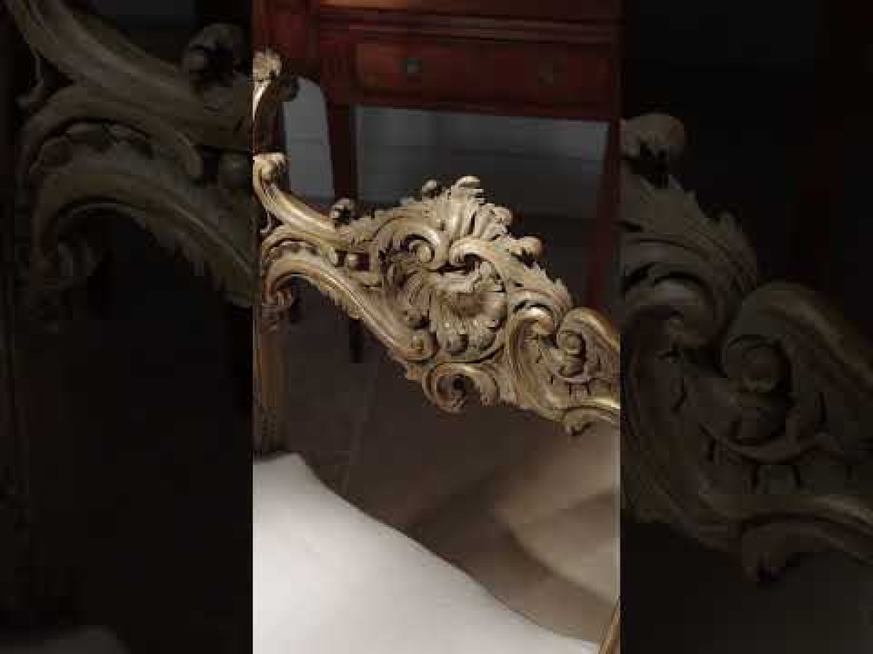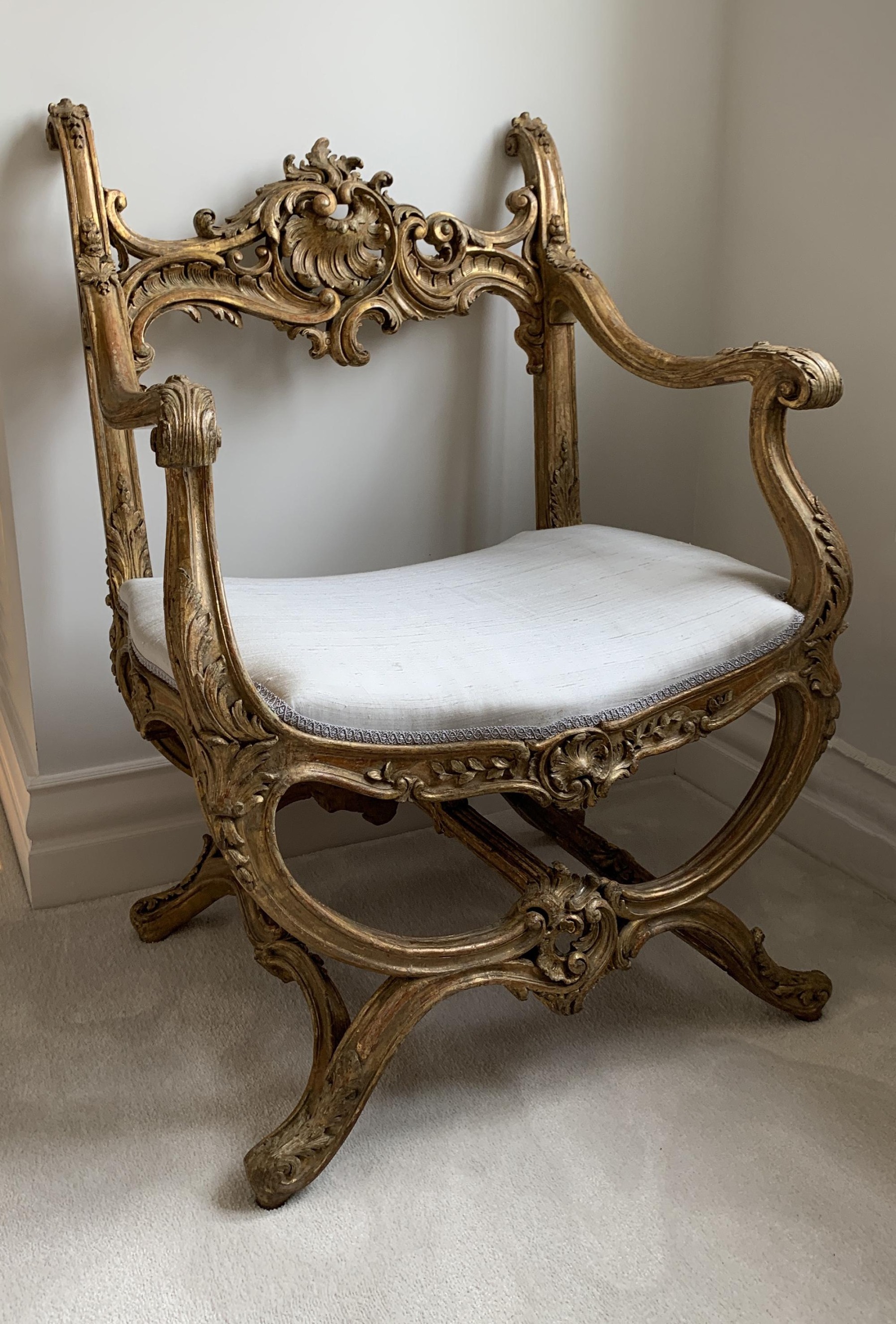 The asymmetrical scroll and leaf-carved top rail, centred on a stylised shell within over scrolled uprights, above a newly upholstered grey silk padded and dished seat between scroll-ended arms, raised on a decorative foliate carved scrolling X-frame base with a conforming central stylised shell.