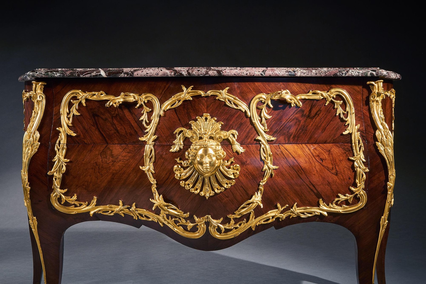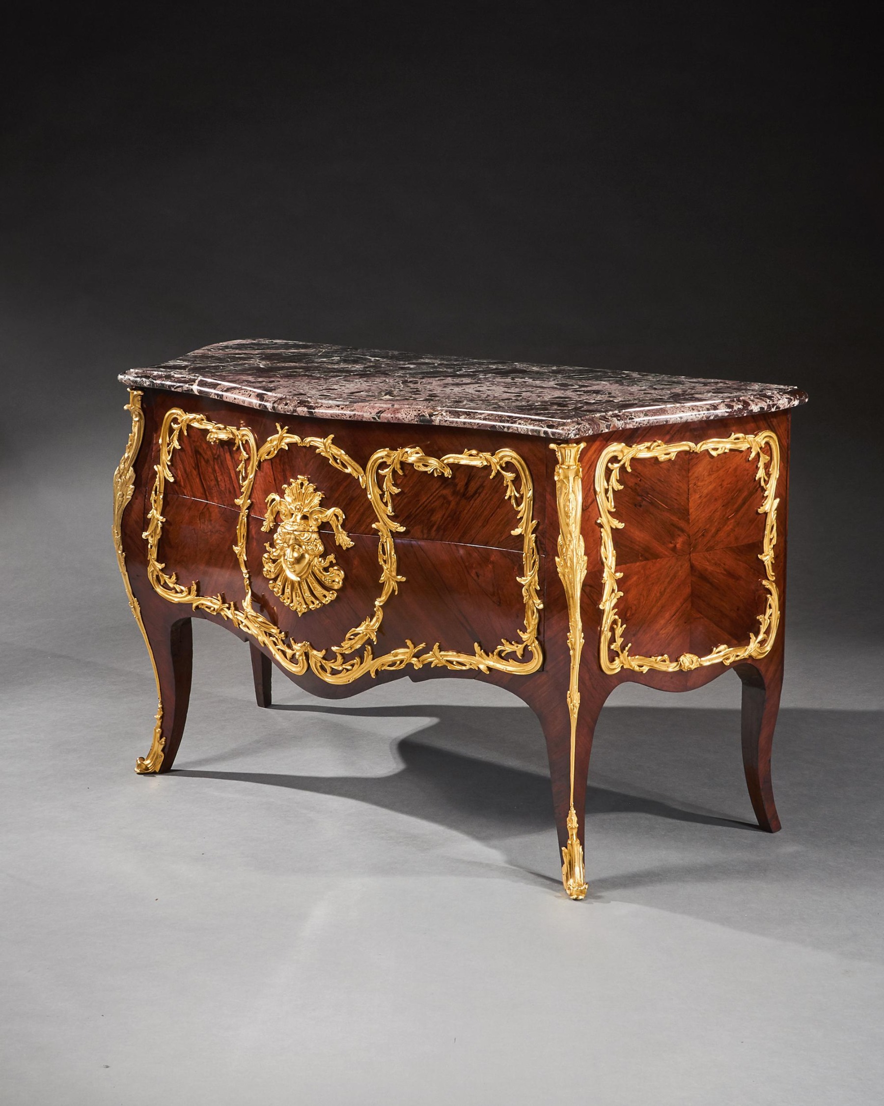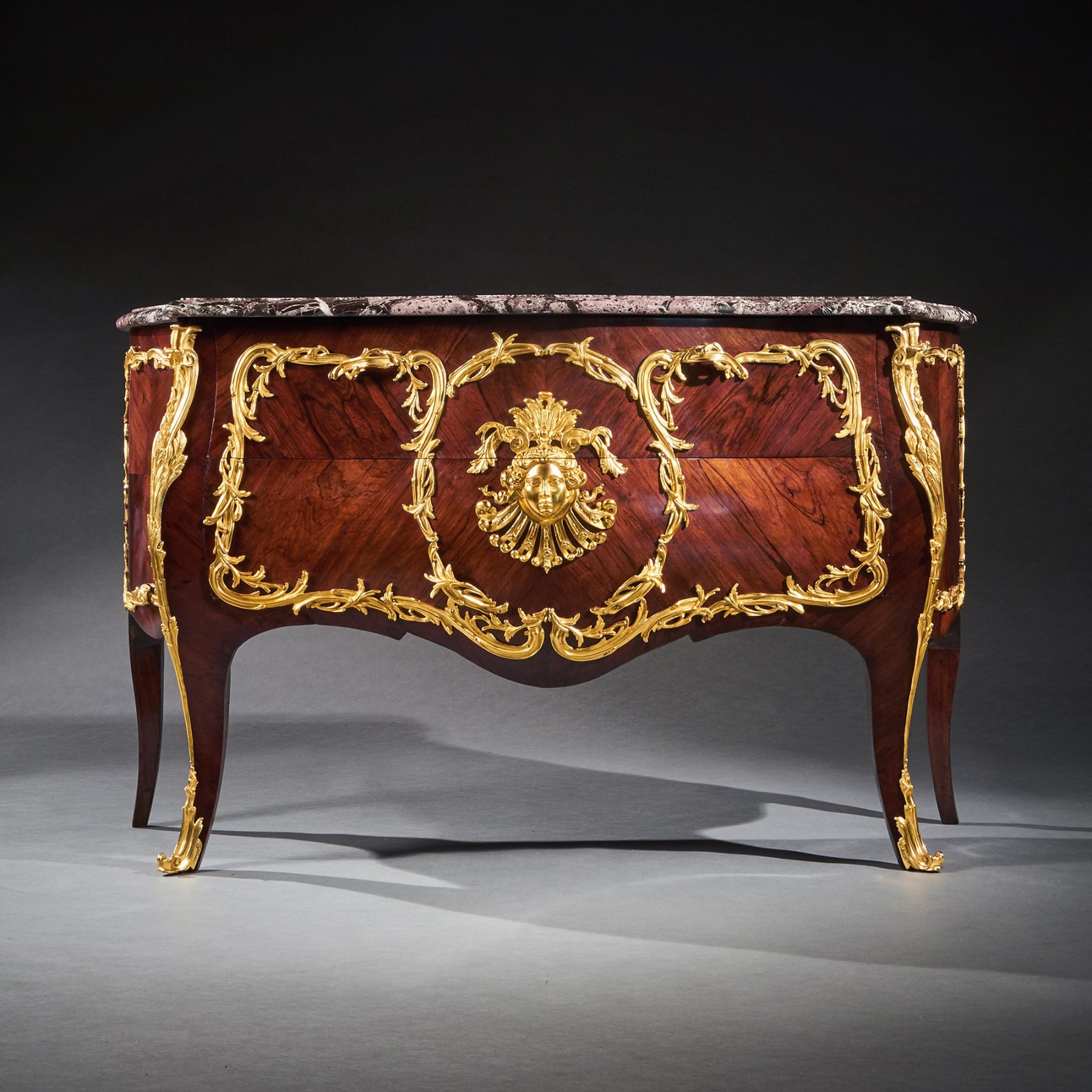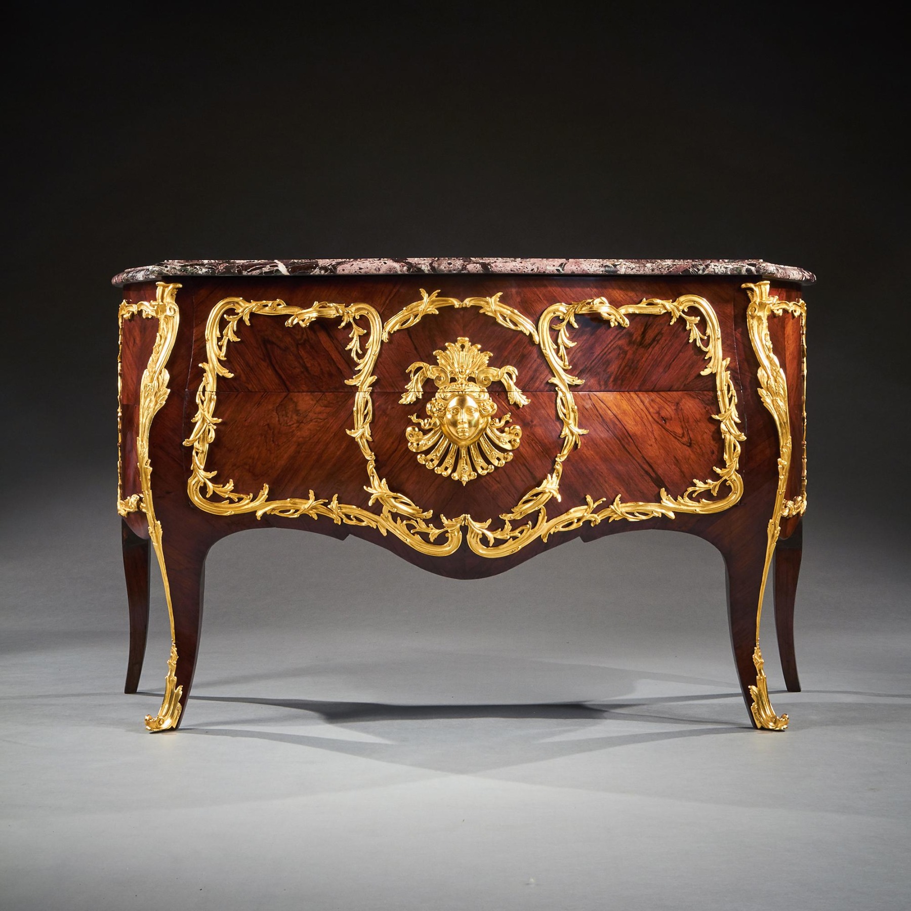 An impressive commode of imposing bombe form with finely coloured quarter veneered and entwined foliate and scroll mounts. The shaped and moulded 1 1/4 inch thick Breche Du Benou marble top above two drawers sans traverse centred by a female mask within a tripartite scrolling frame, with conforming sides, raised on splayed feet ending in gilt sabots. The top of the carcass with stencil markings Meubles Et Bronzes Anciens / Hopillart & Leroy Paris 12 Rue Des St Peres.