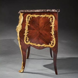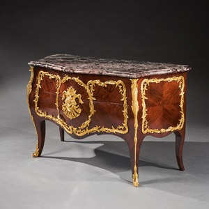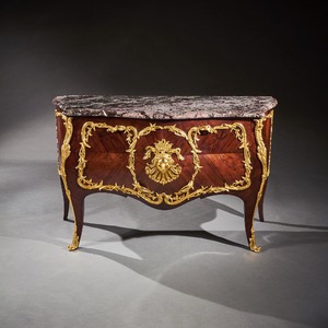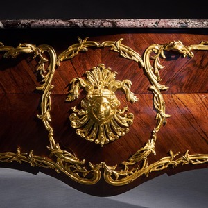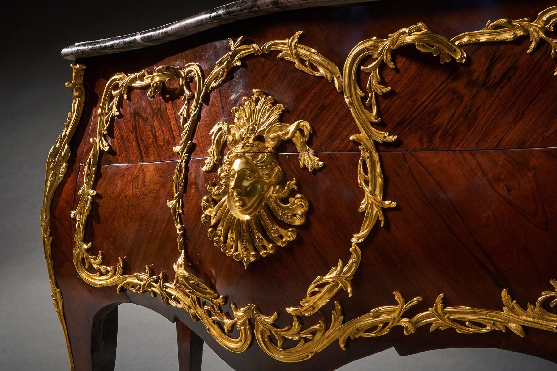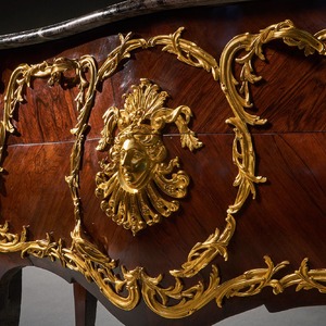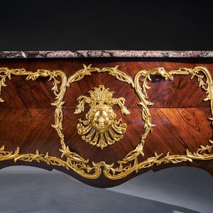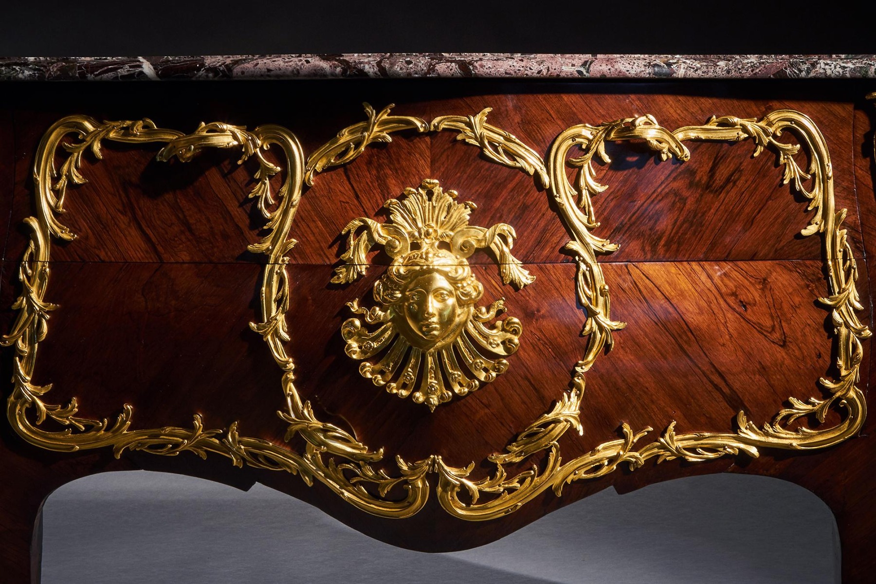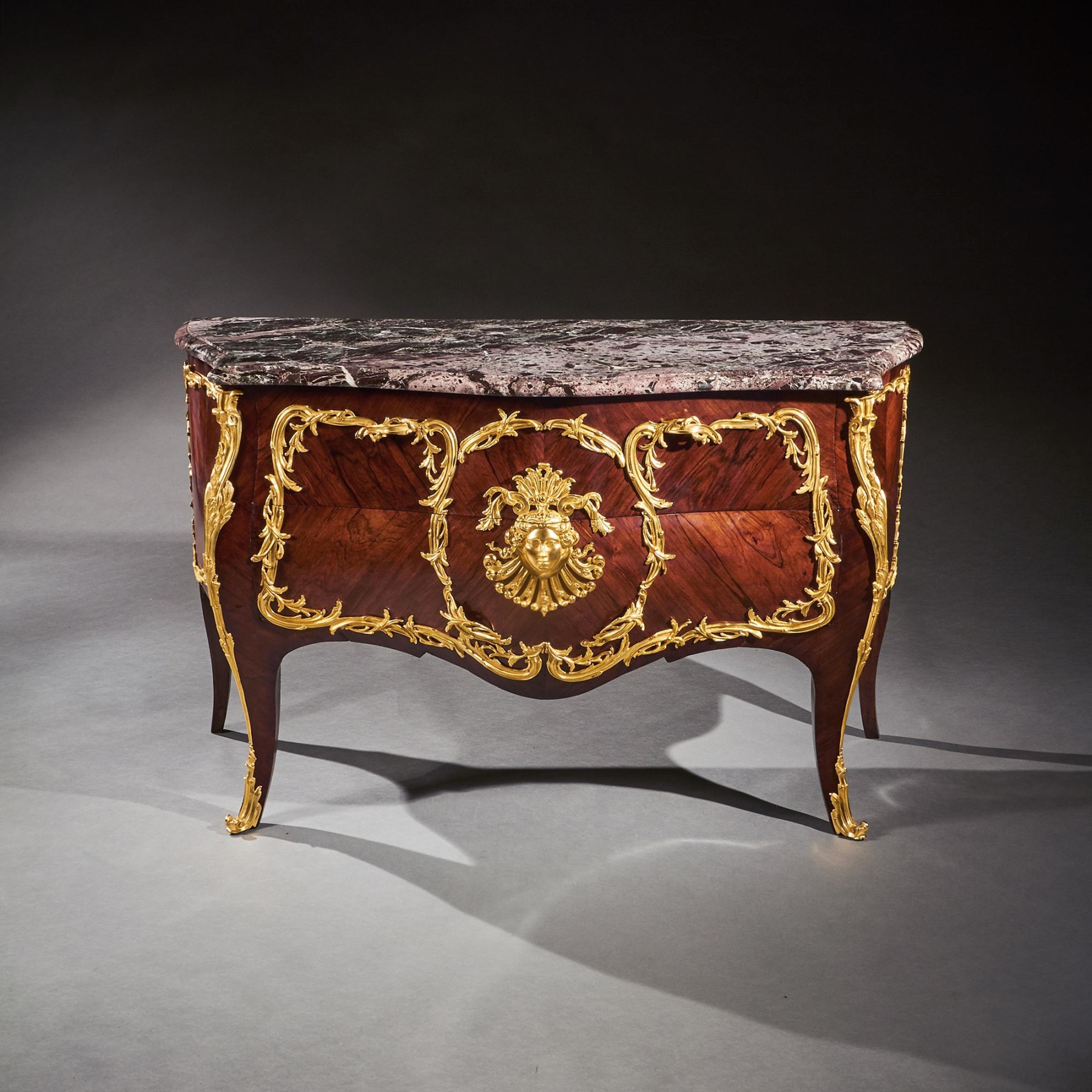 An impressive commode of imposing bombe form with finely coloured quarter veneered and entwined foliate and scroll mounts. The shaped and moulded 1 1/4 inch thick Breche Du Benou marble top above two drawers sans traverse centred by a female mask within a tripartite scrolling frame, with conforming sides, raised on splayed feet ending in gilt sabots. The top of the carcass with stencil markings Meubles Et Bronzes Anciens / Hopillart & Leroy Paris 12 Rue Des St Peres.