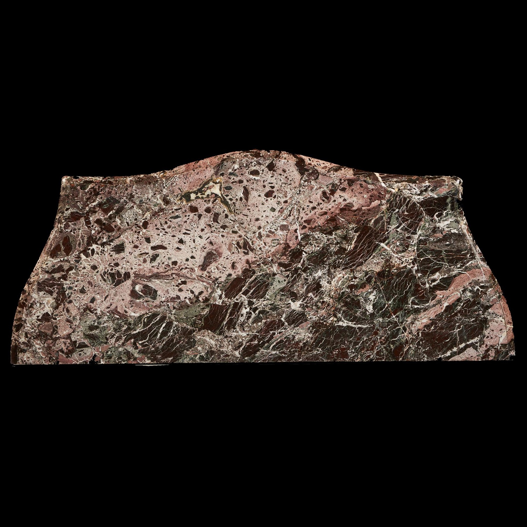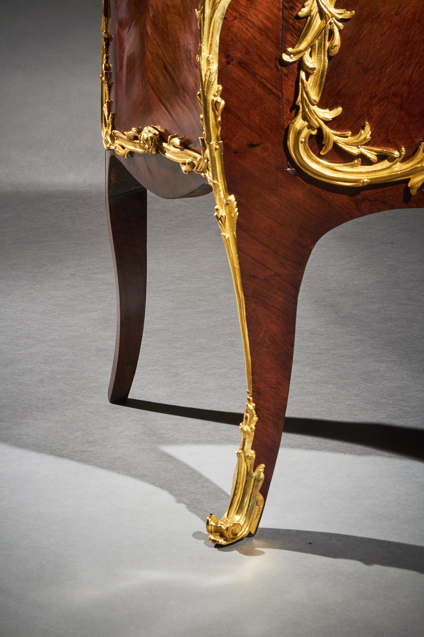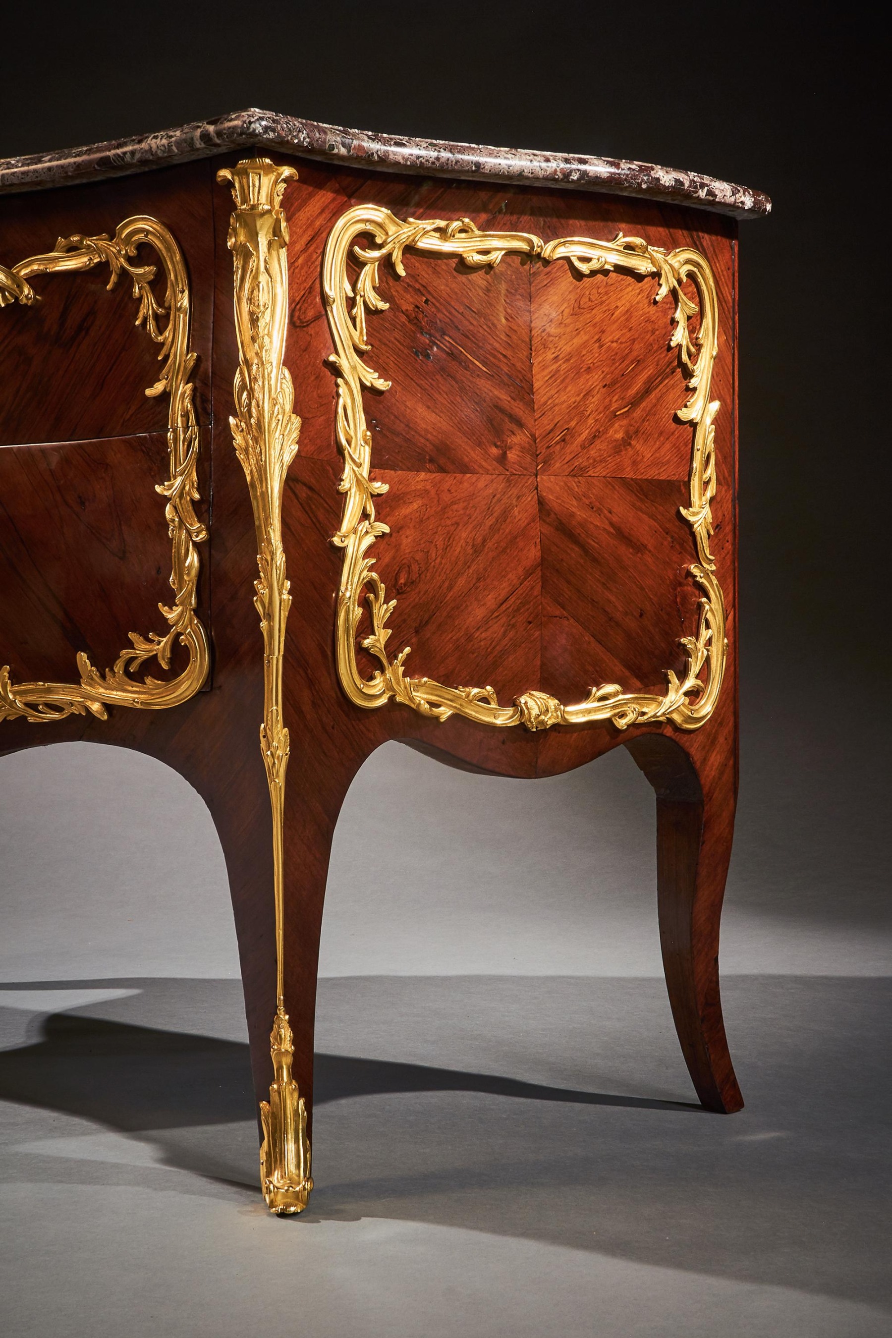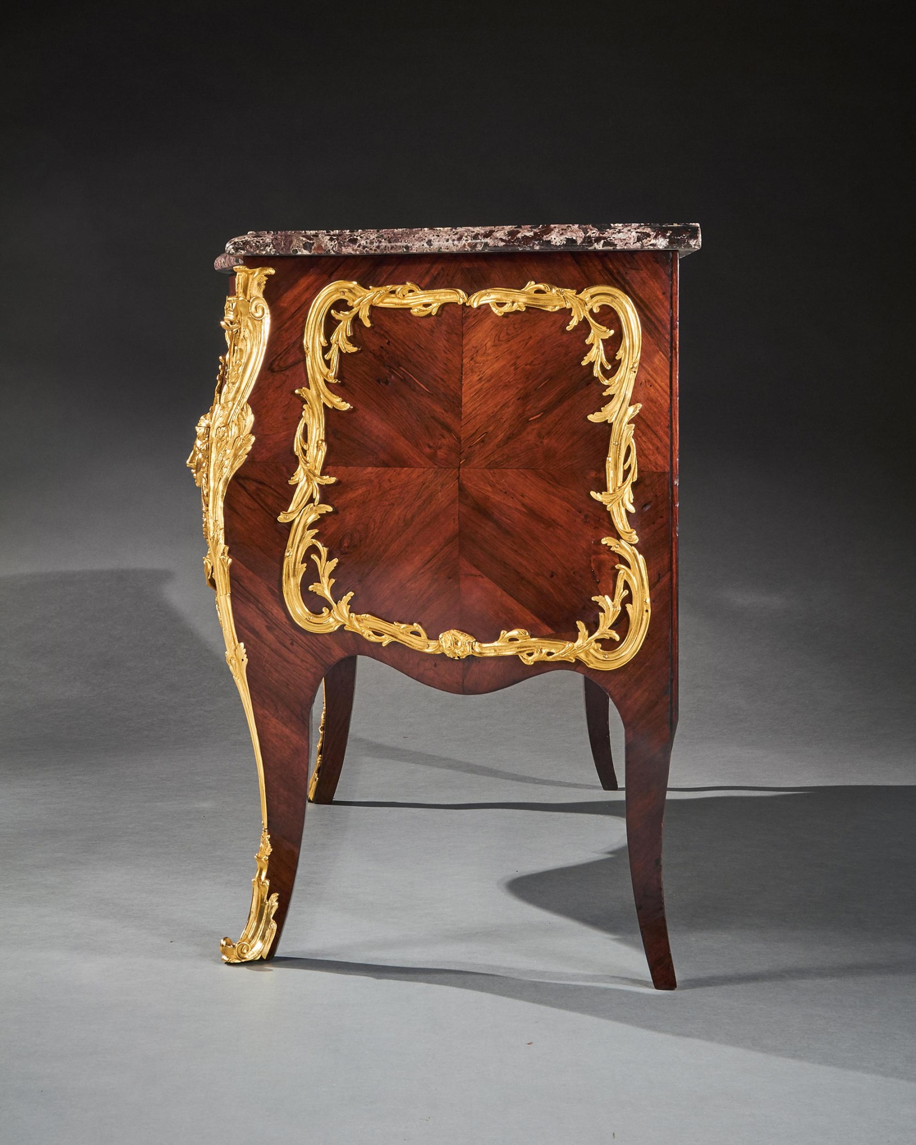 An impressive commode of imposing bombe form with finely coloured quarter veneered and entwined foliate and scroll mounts. The shaped and moulded 1 1/4 inch thick Breche Du Benou marble top above two drawers sans traverse centred by a female mask within a tripartite scrolling frame, with conforming sides, raised on splayed feet ending in gilt sabots. The top of the carcass with stencil markings Meubles Et Bronzes Anciens / Hopillart & Leroy Paris 12 Rue Des St Peres.
