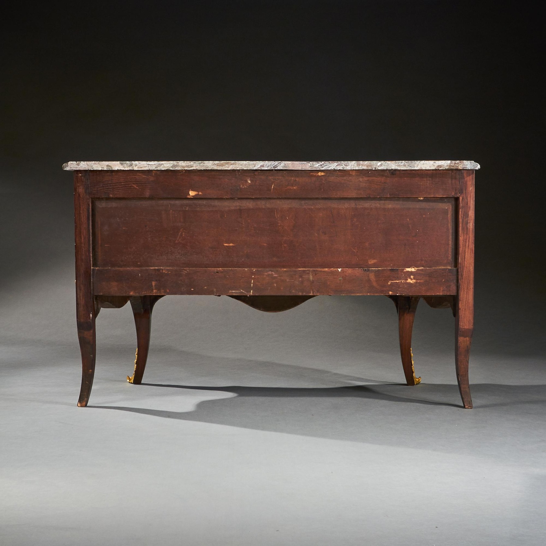 In wonderful condition with a superb faded colour to the veneers with contrasting gilt ormolu. The top having a finely coloured and superbly figured rare marble, there has been an extremely professional historic repair / strengthening which is only visible to the underside. We have added an image of the back showing this commode being older than most dating to mid 19th century.