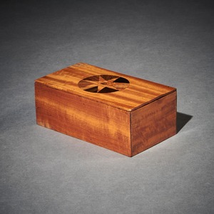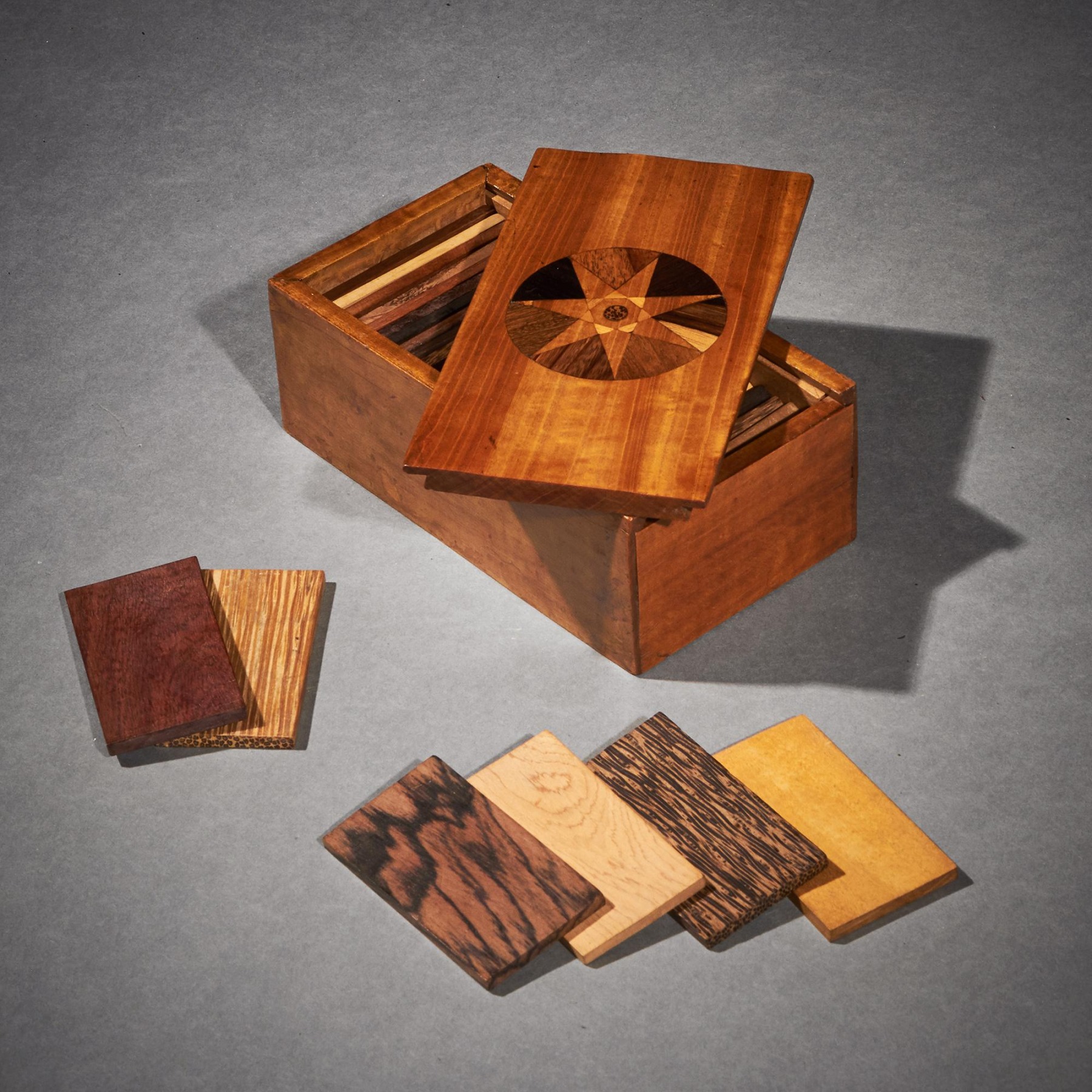 The solid satinwood carcass of rectangular form with sliding cover, having a marquetry star inlaid roundel comprising of various specimen veneers, slides back to reveal an interior with thirty rectangular specimen wood plaques each bearing their identification titles hand written on paper to verso.
