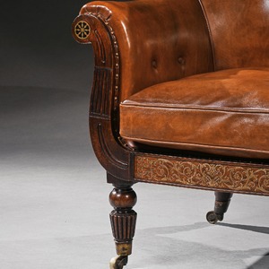Upholstered in a hand dyed tan leather, the padded and scrolled shallow buttoned spoon shaped back above a cushion seat, flanked by stuffed scroll arms with carved and reeded arm facings having brass inlaid roundel medallions. The seat rail with a rarely seen inlaid brass scroll, on turned and reeded tapering legs terminating in the original brass cap castors.