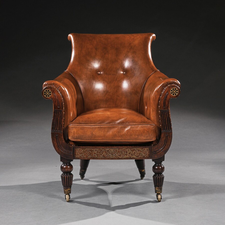 A fine quality brass inlaid Regency leather bergere which has all the characteristics of the famous cabinet makers Gillows but without a stamp as often is the case. Extremely rare to be brass inlaid with the roundels and brass scroll work to the front rail. Its is also extremely comfortable due to the form having a shaped back.
