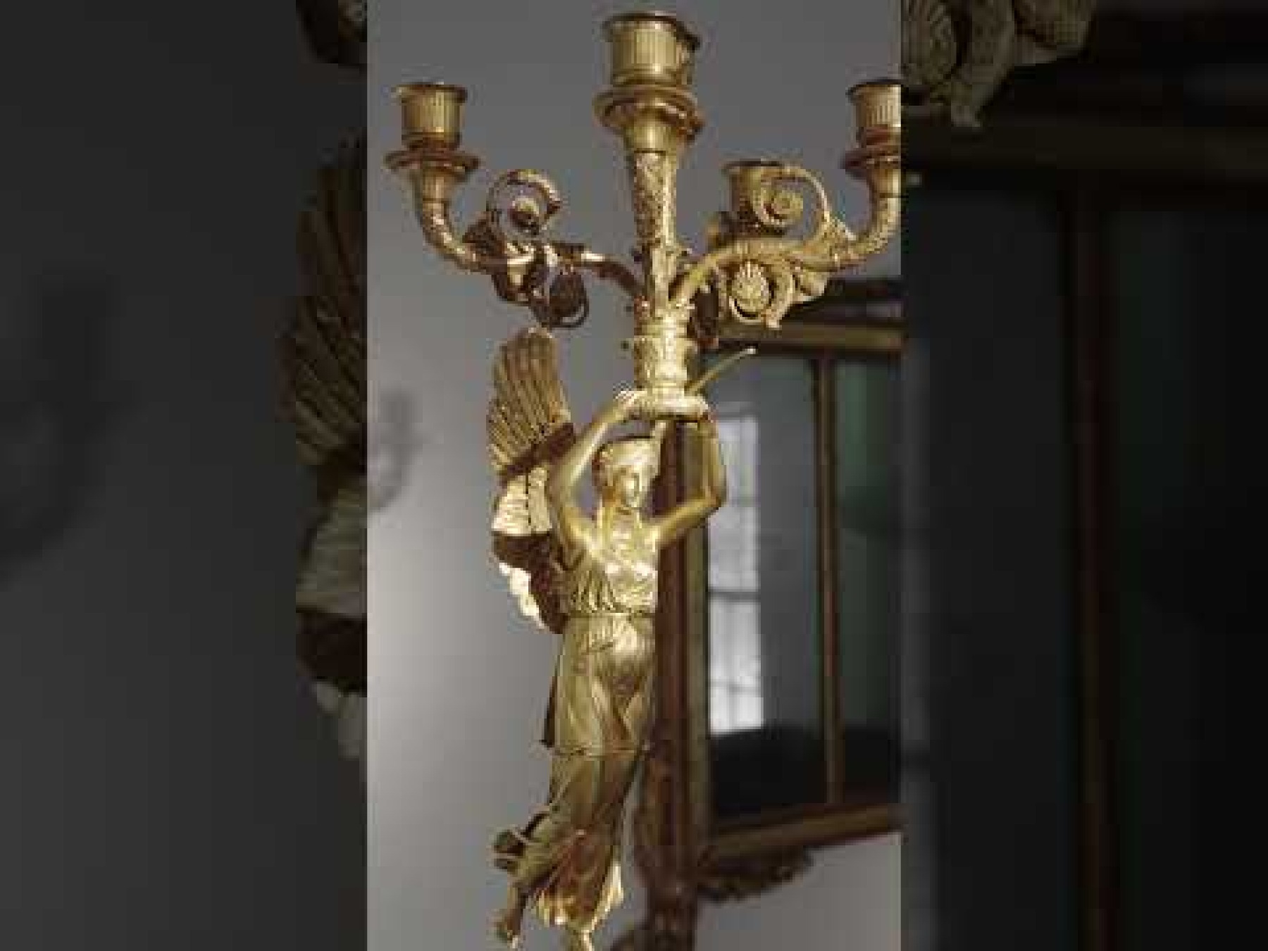 A set of four bronze, five-light candelabra, each in the form of patinated winged Victory holding, with outstretched arms, a gilt laurel wreath by Thomire, Paris (c.1810-12). Again, Victory is balanced on one foot, here on a starred sphere and a square plinth. Acquired by the Prince Regent for Brighton Pavilion. http://www.rct.uk/collection/search/14/collection/11853/set-of-candelabra