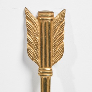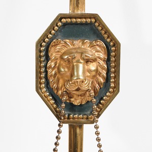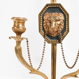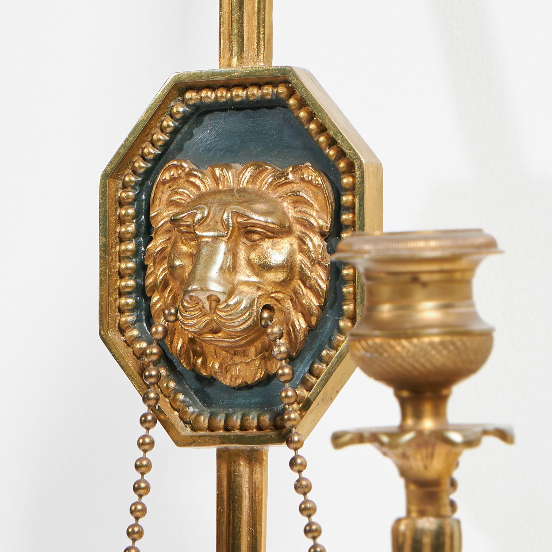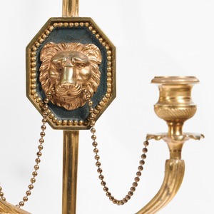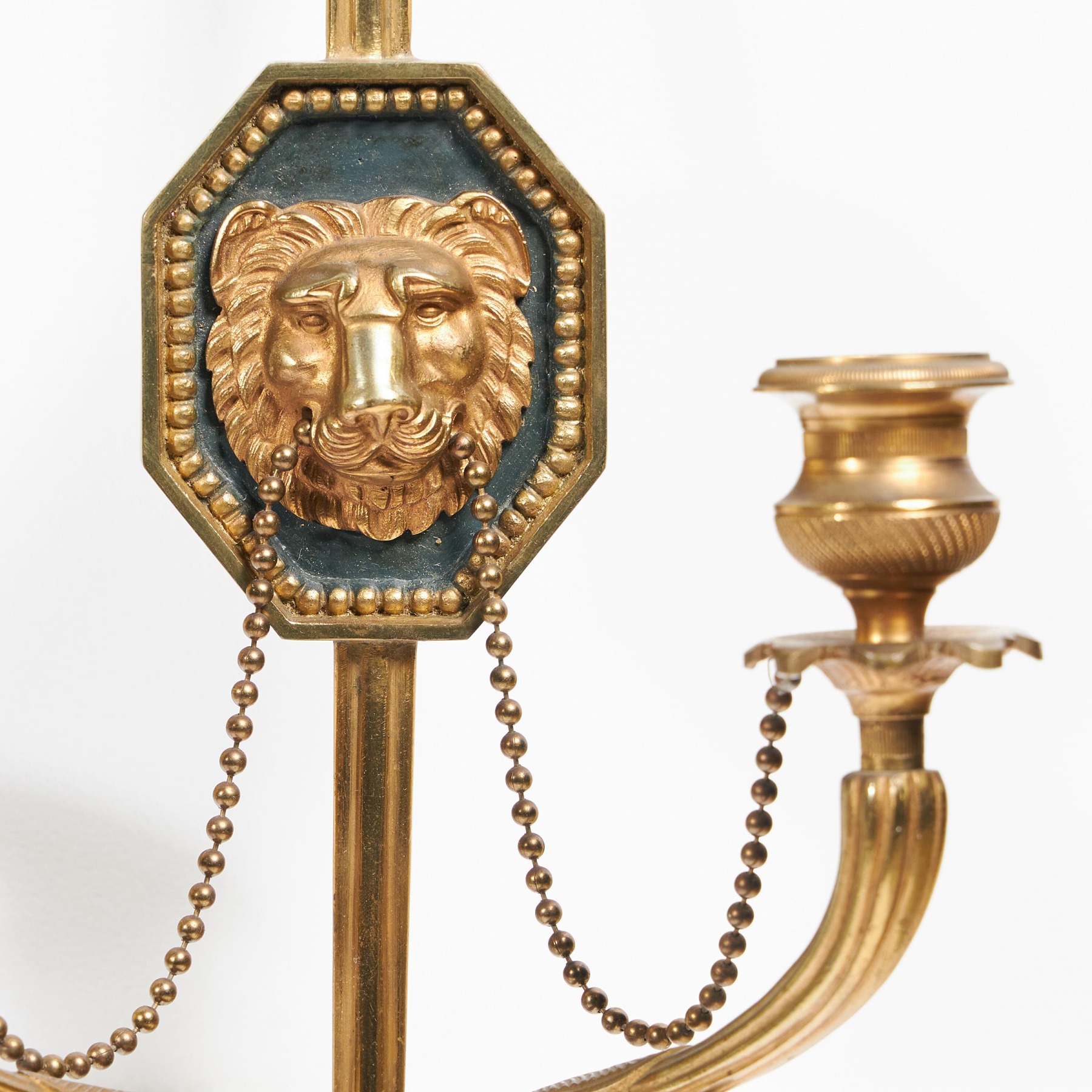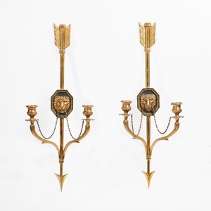 These lovely wall lights are conceived as notched arrows with lion mask plaques in the centre of the shafts. The mouths of the lions, mounted on bronze backgrounds, hold gilt swags of interconnected beads, the same beads as are used as the decorative border framing the masks. Two naturalistic branches are attached to the lower part of the arrow shaft and these terminate in drip trays with floral detailing and candle nozzles or sconces with engine turning.
