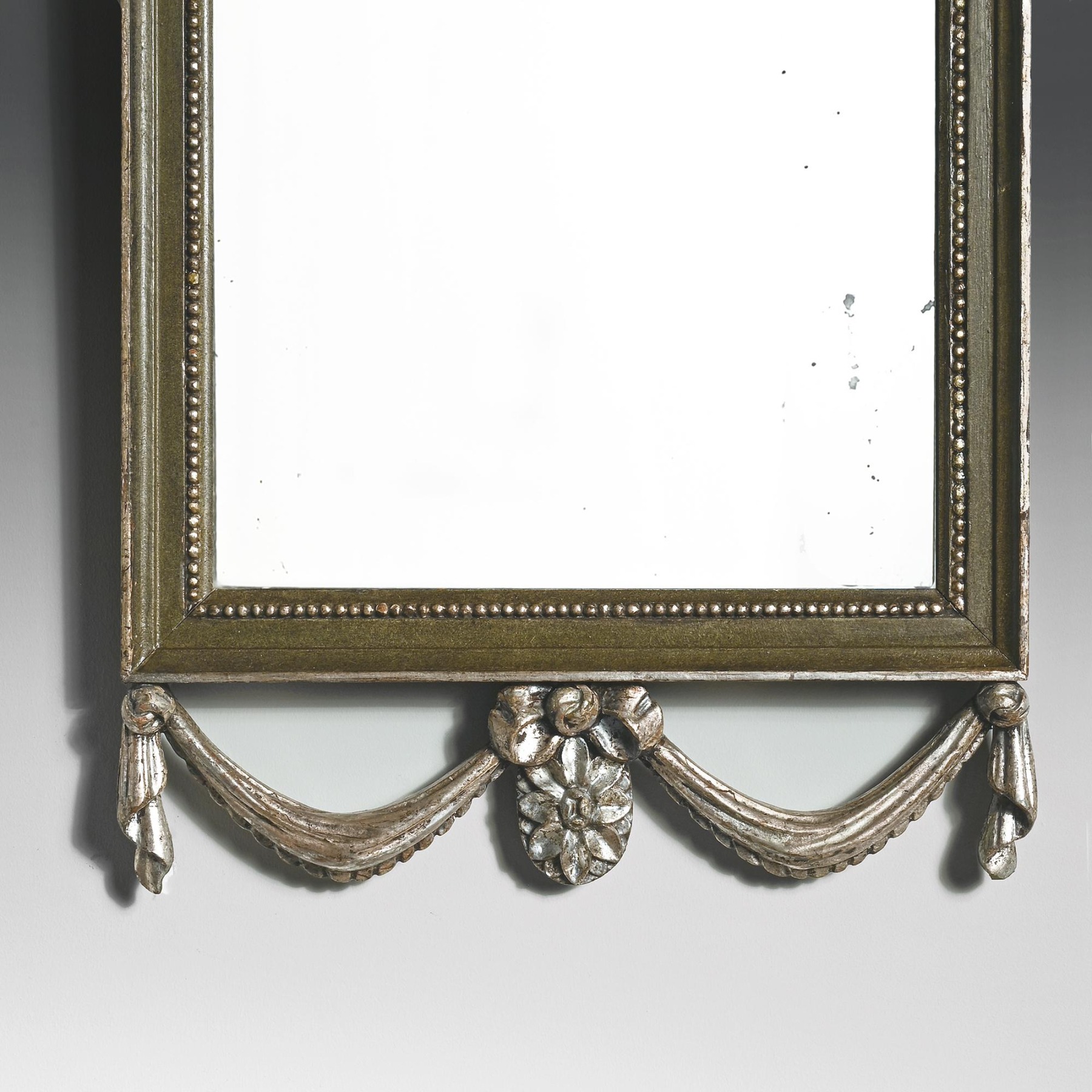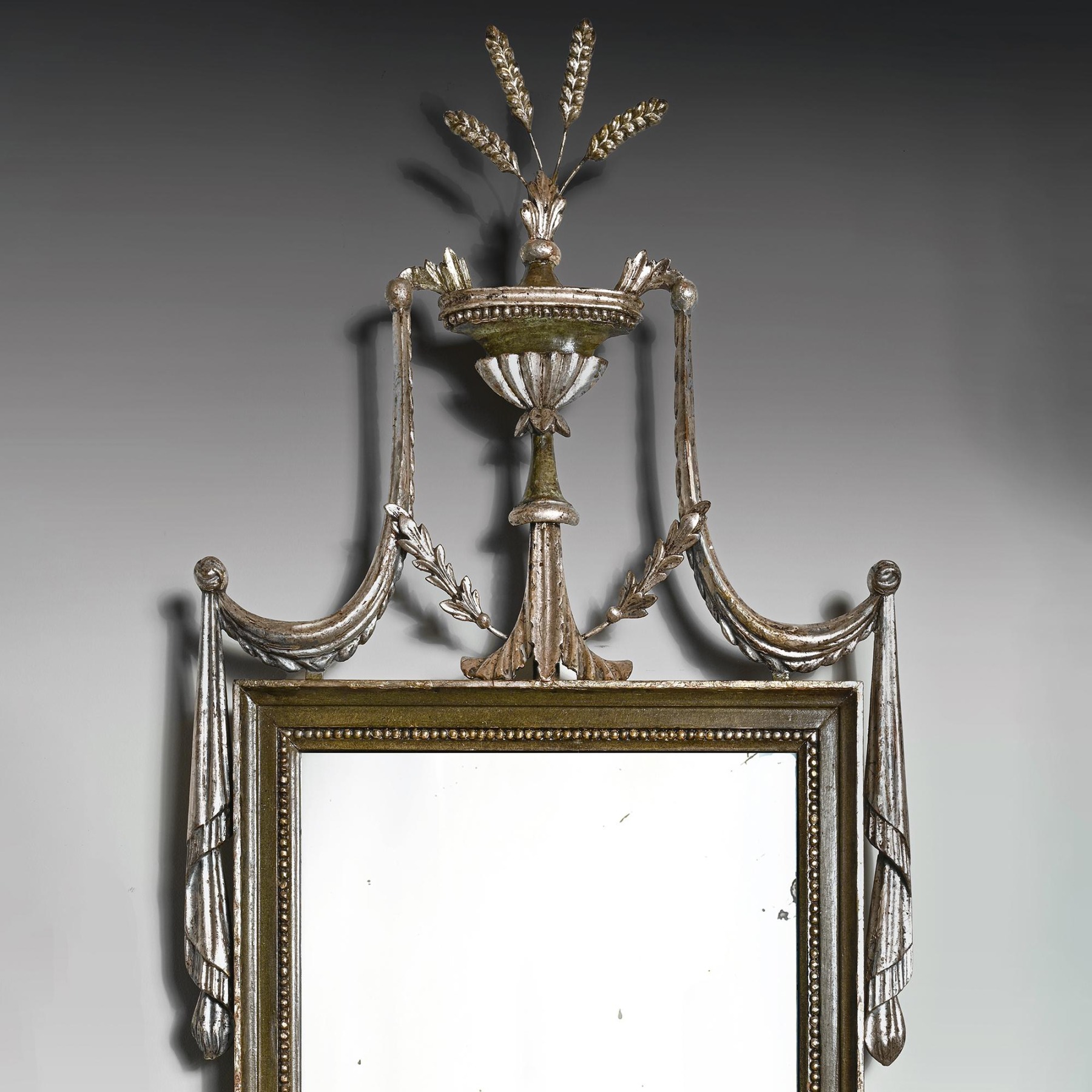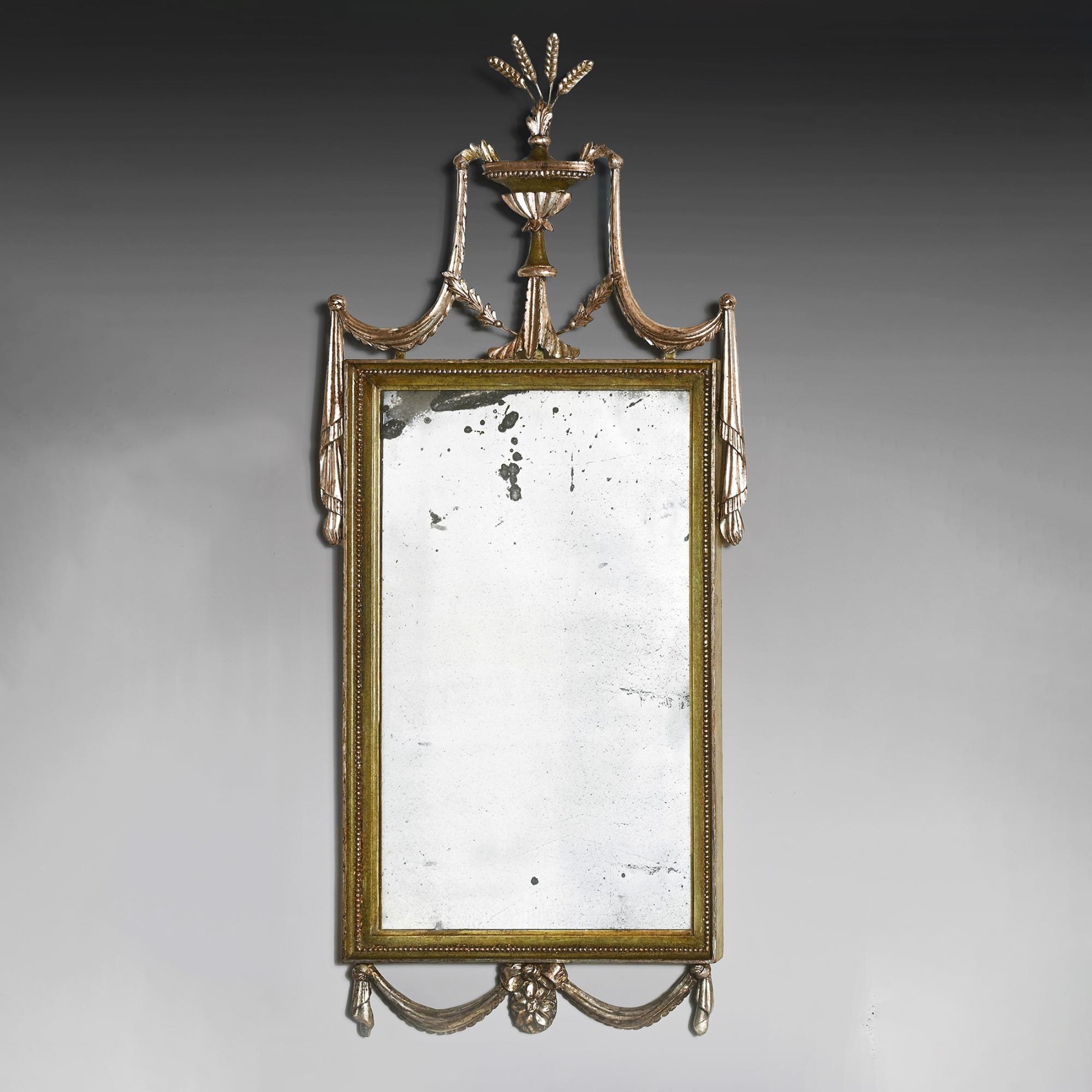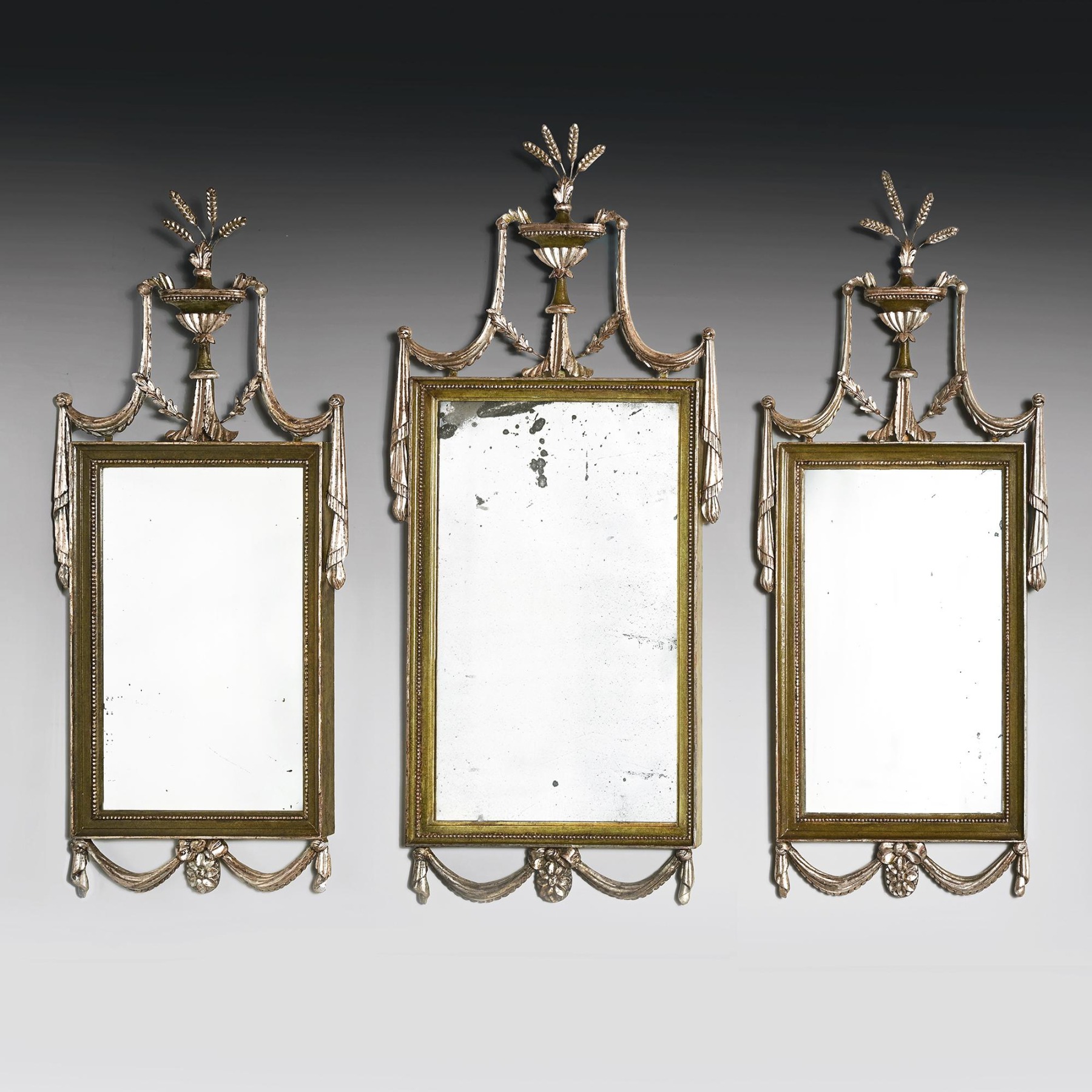 The mirrors of rectangular shape with central urn and swag crestings topped with wheat sheaf finials. The swags of drapery continuing around the sides of the frames and being utilised on the lower aprons, complete with central floral paterae. The inner borders of the frames with beaded detailing and all the mirrors retaining both their original plates and the interesting silvered gesso finish with green painting, a highly unusual combination.