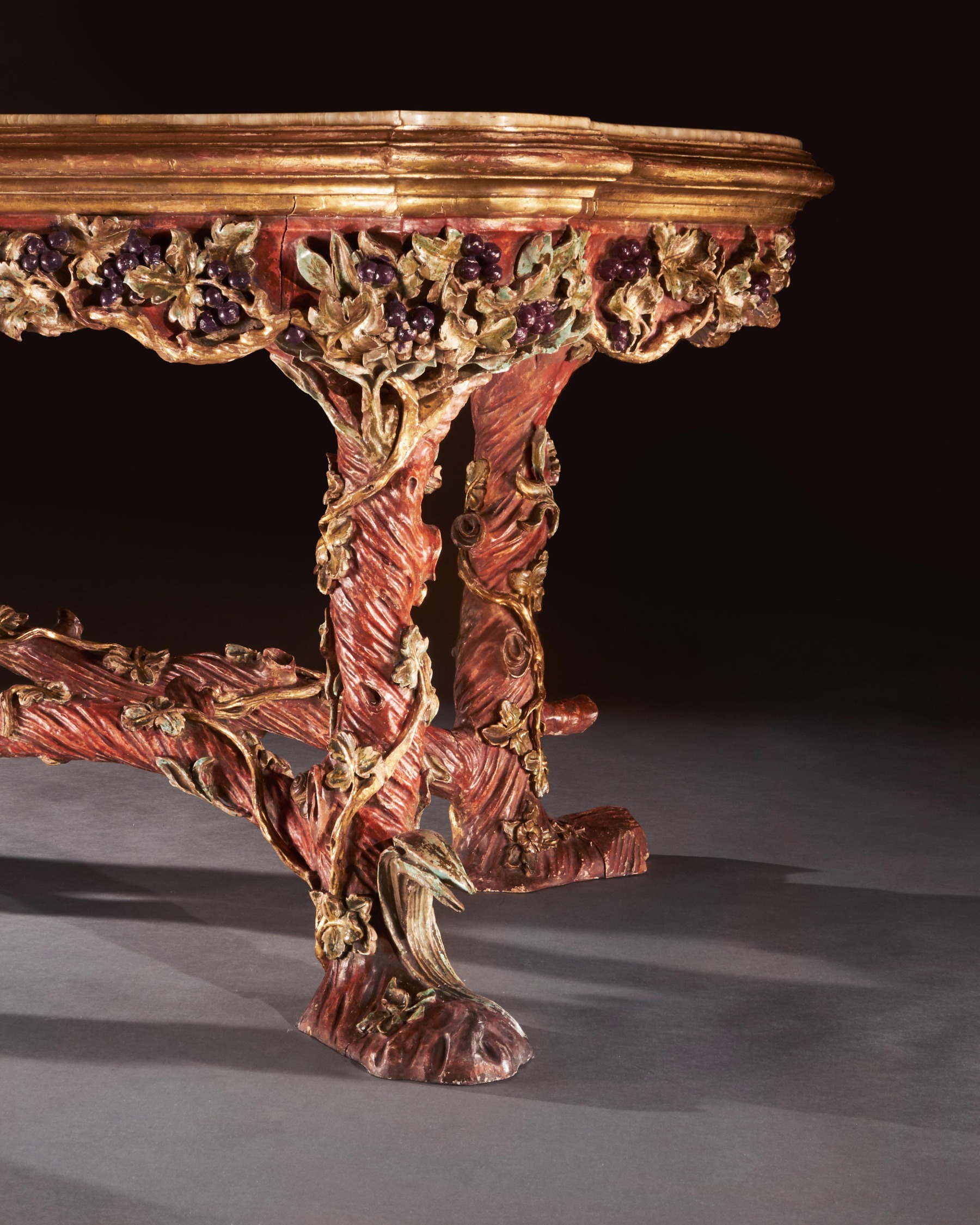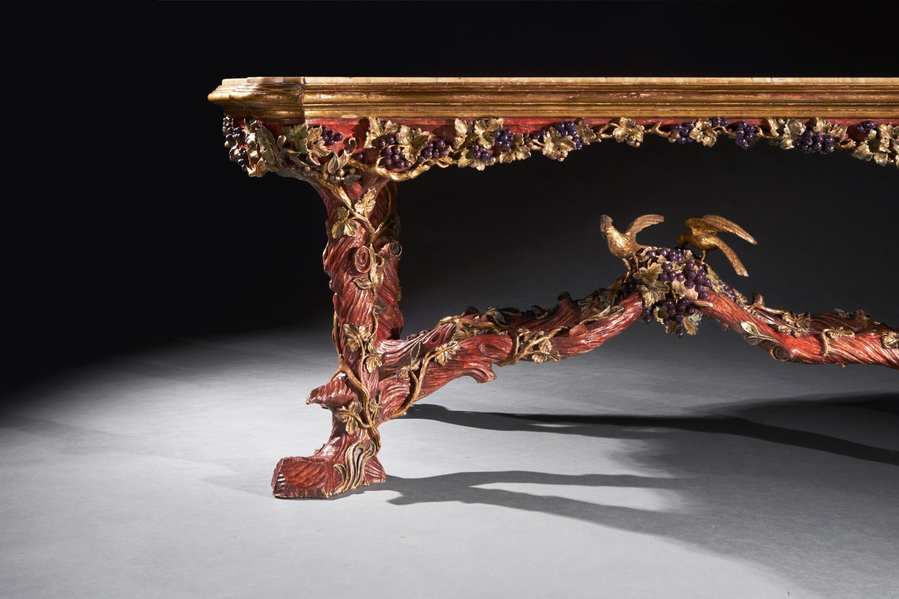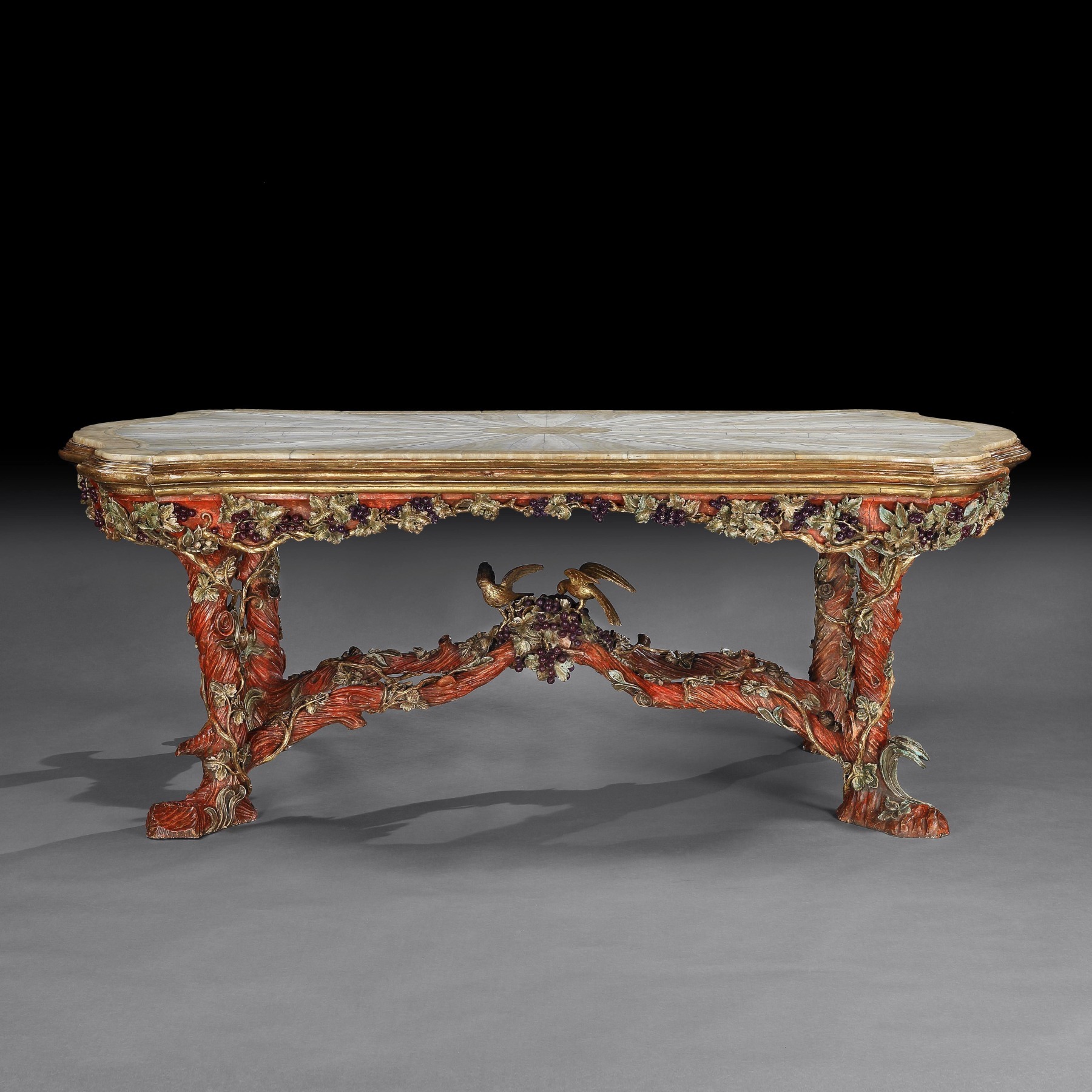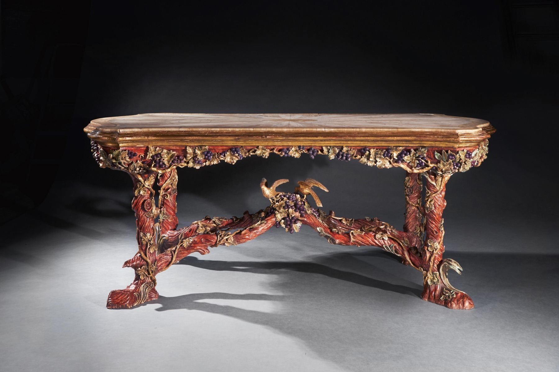 This outstanding table almost fantasy like is inspired by Venetian designs combining the exuberance of rococo with the enthusiasm for naturalistic carving so beloved of the Italian craftsman.