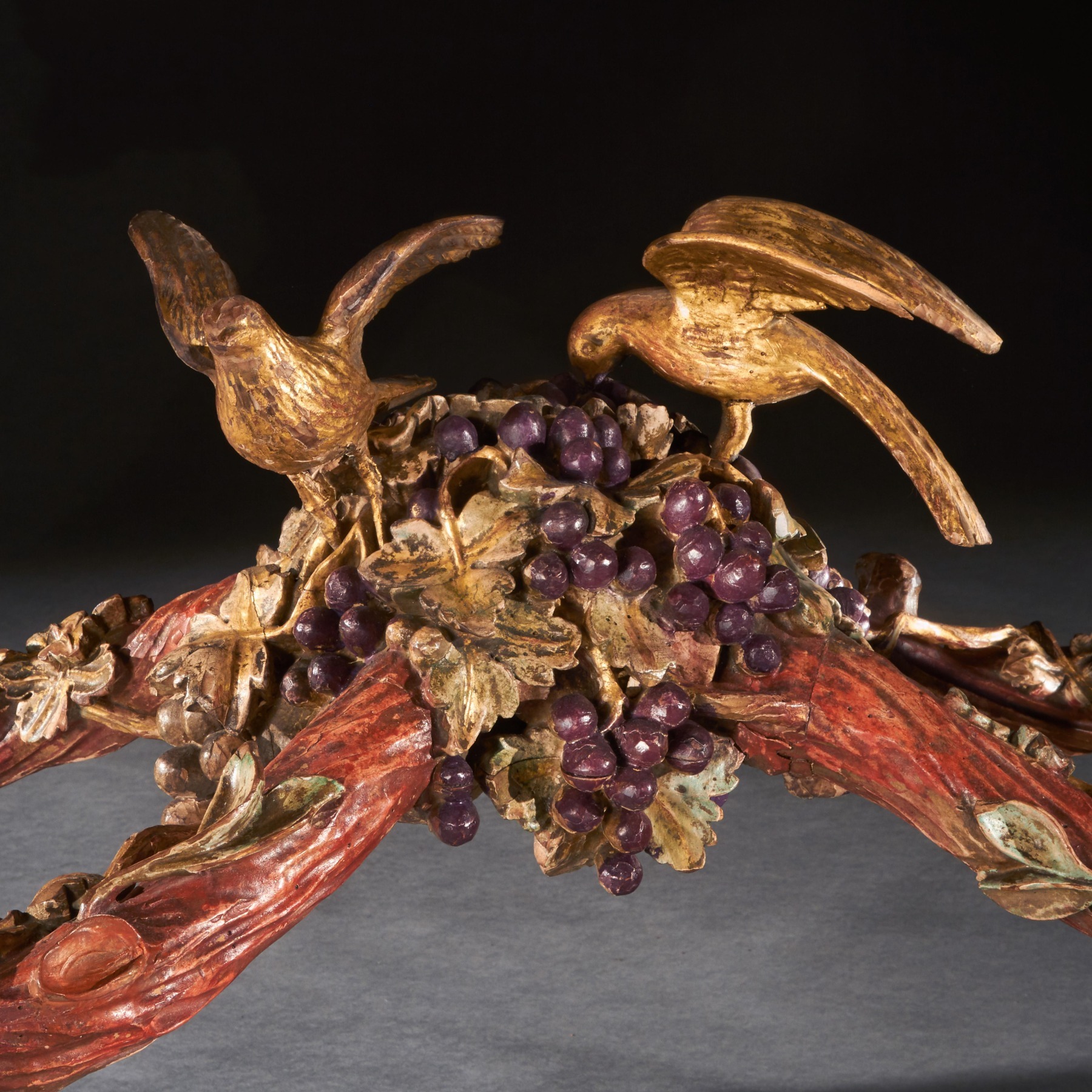 The elongated cartouche-shaped top inset with a wonderful radial pattern of onyx within a moulded border, on a polychome and parcel-gilt frame naturalistically carved depicting fruiting vine of tree branches, leaves, grapes, snails, lizard and dragonfly with the shaped cross stretcher with a finial carved with two doves.