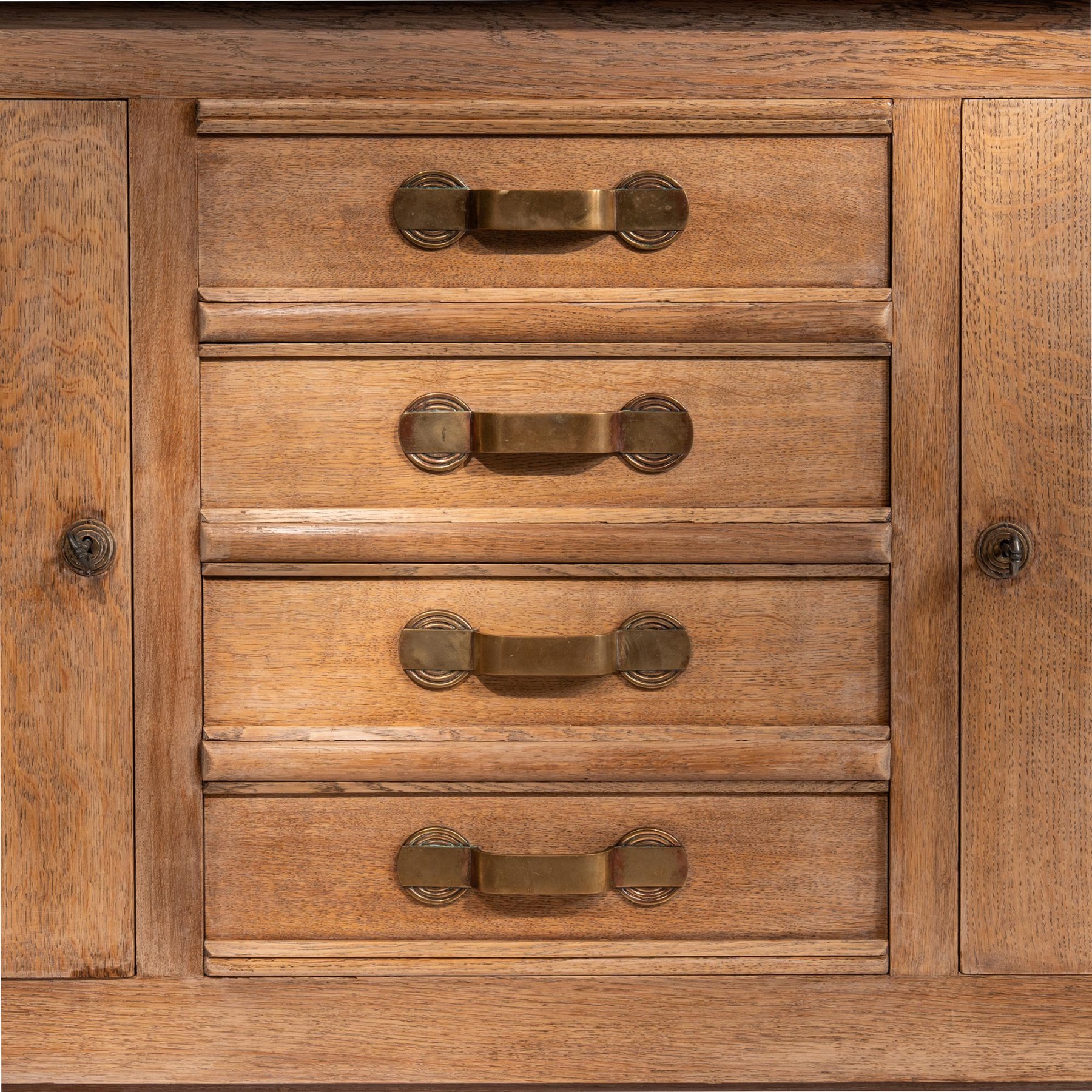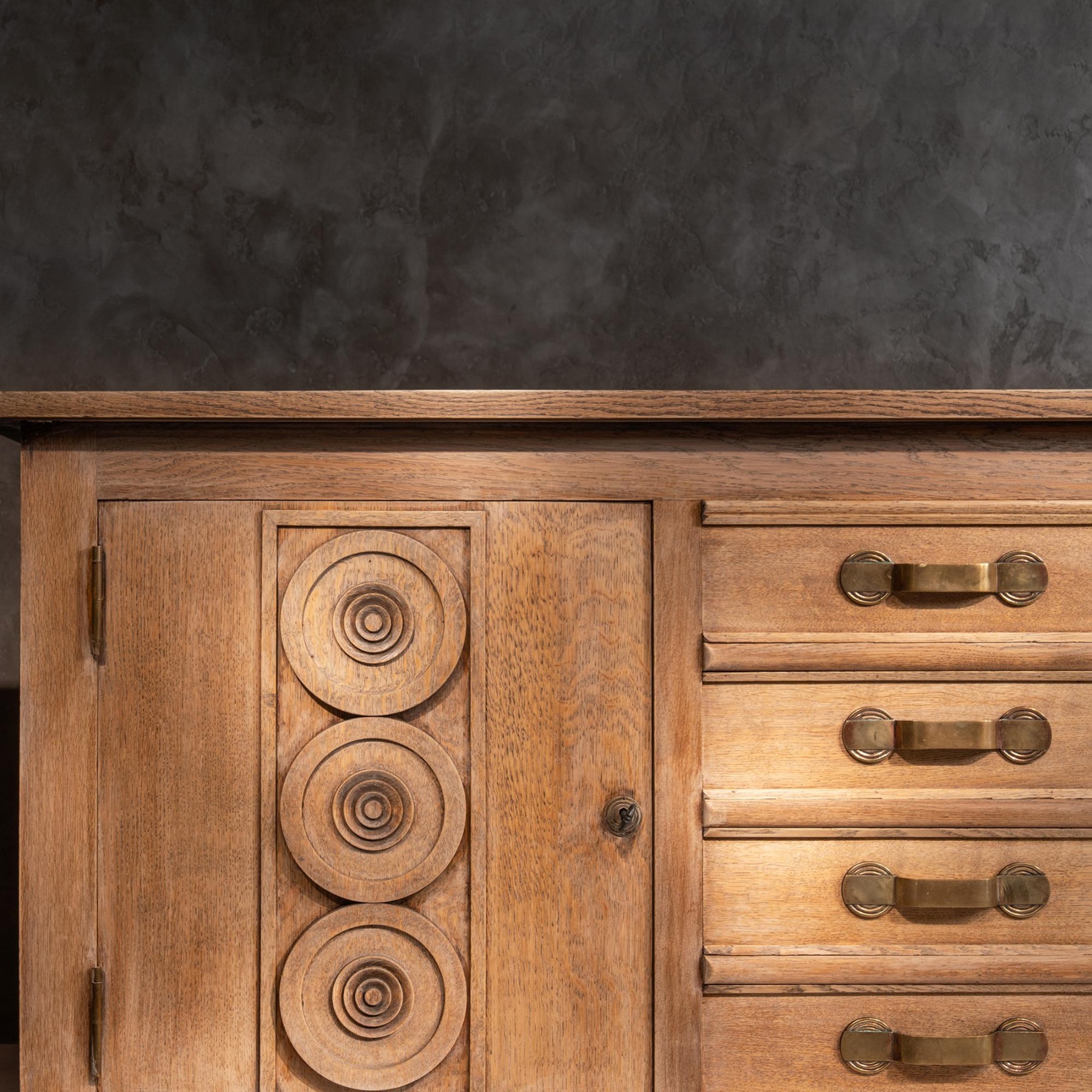 Undoubtedly made in Paris around 1940, this fine piece was executed in oak of fine timber with the strong figuring of the timber contrasting beautifully with the clean lines of the design itself. The planked and crossbanded top hangs over a broadly rectangular structure with rounded corners on the apron at the base. This combination of curves and straight lines also applies to the decoration used to adorn the piece, notably on the cast handles which employ concentric circles on the back plates and straight line pulls, and of course on the panelled cupboard doors with applied turned roundels, also of concentric circular design.