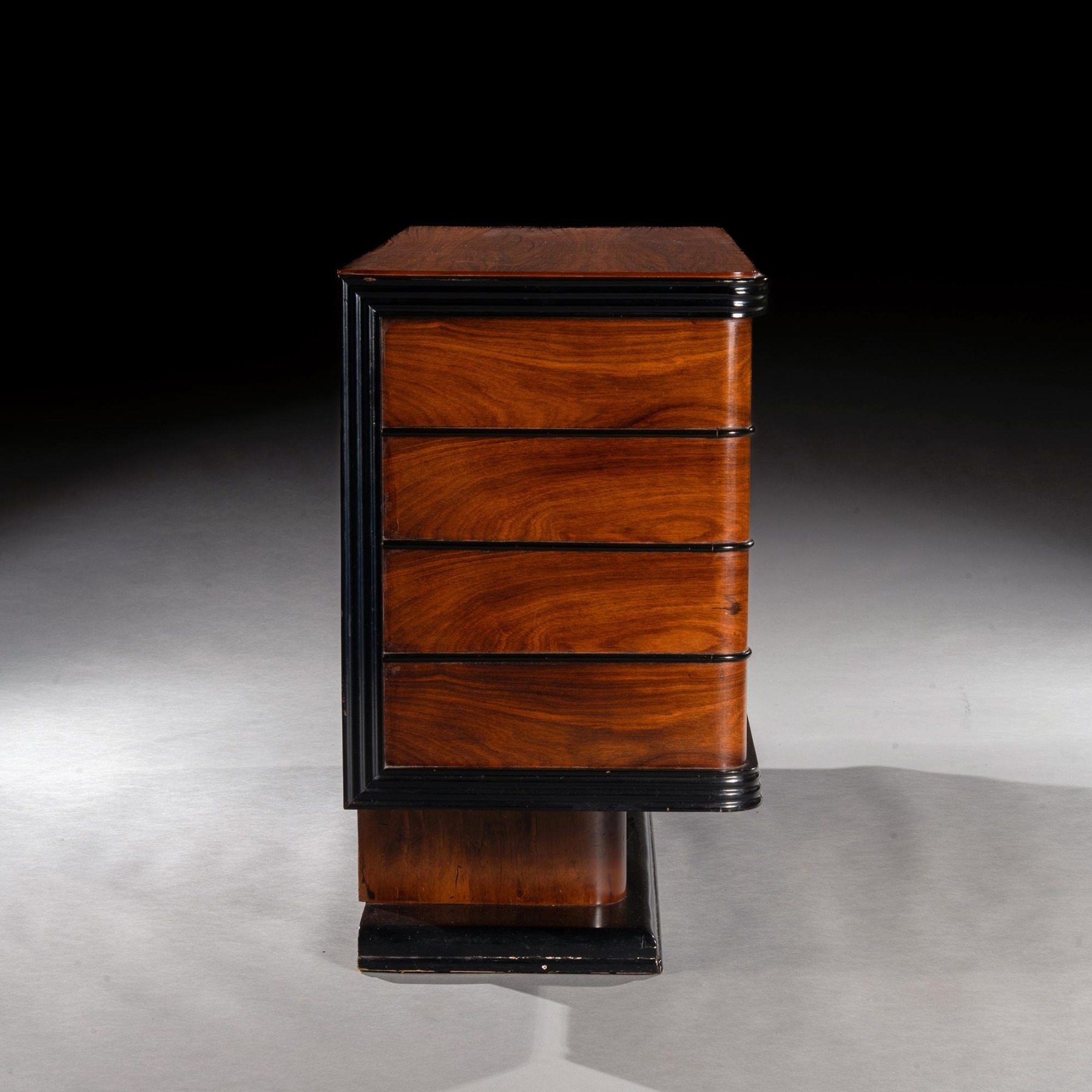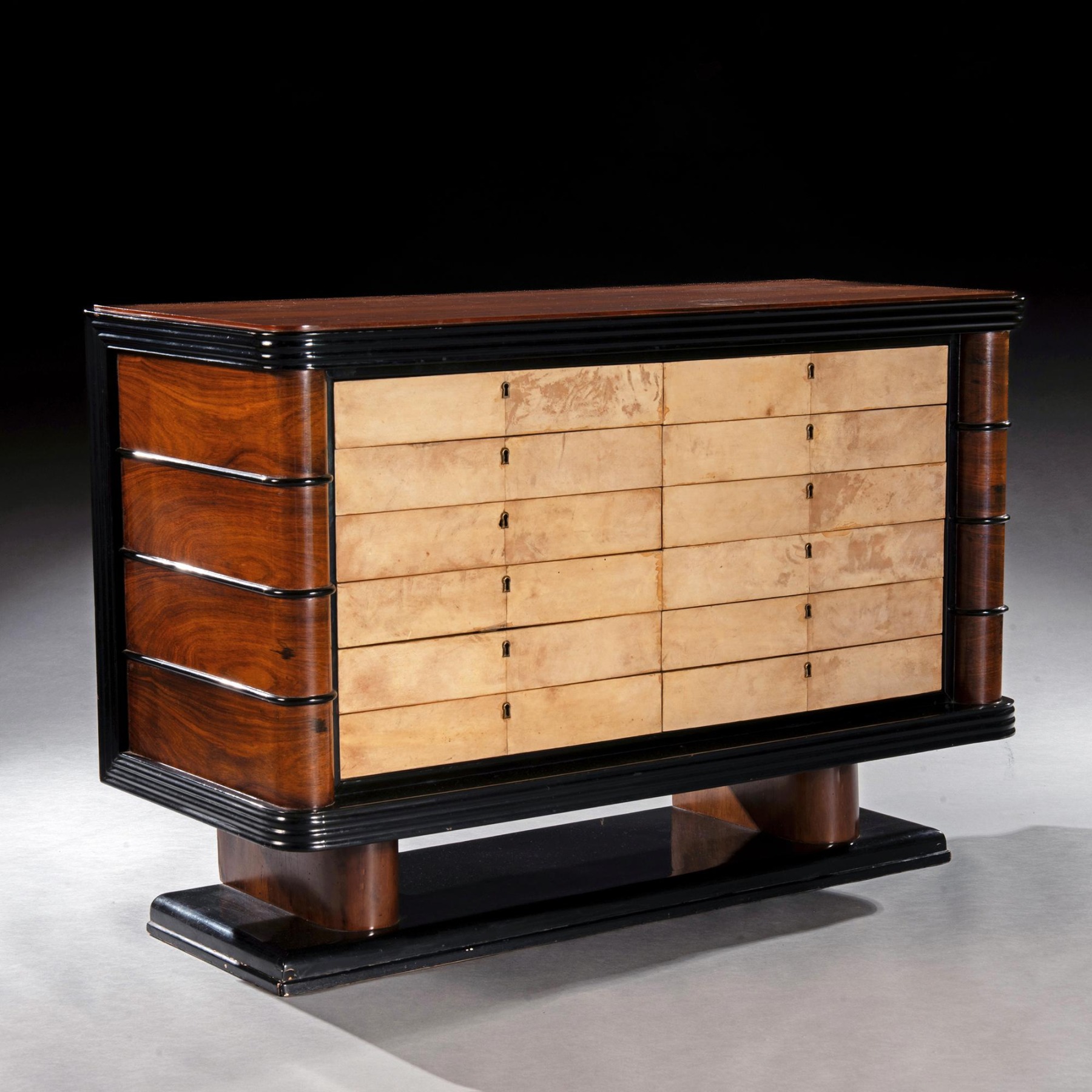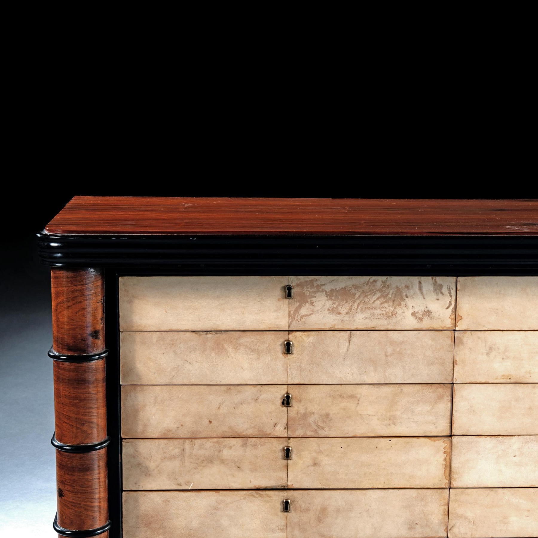 This fine and interesting commode is veneered primarily in palisander wood of lovely colour and figure. There are additional ebonised mouldings on the aprons to top and bottom of the piece and on the rounded pilasters to each side of the drawer section. The twelve drawers are of uniform size and are covered in fine parchment which has aged beautifully with signs of use and character. The designer of the piece has chosen not to ruin the clean lines with drawer handles so the pieces open using the key as a handle. The carcase of the piece is supported on rounded supports and a slim plinth base.