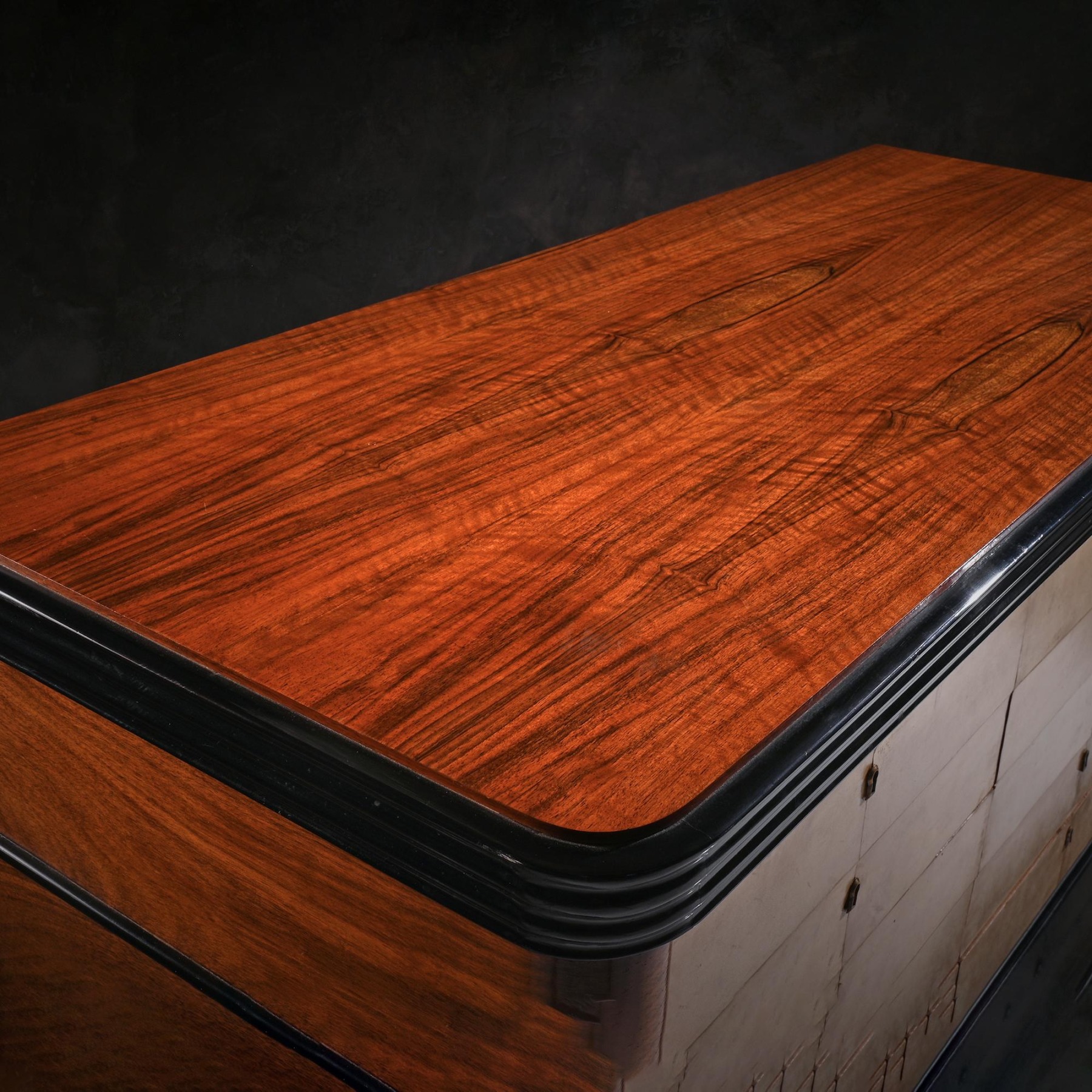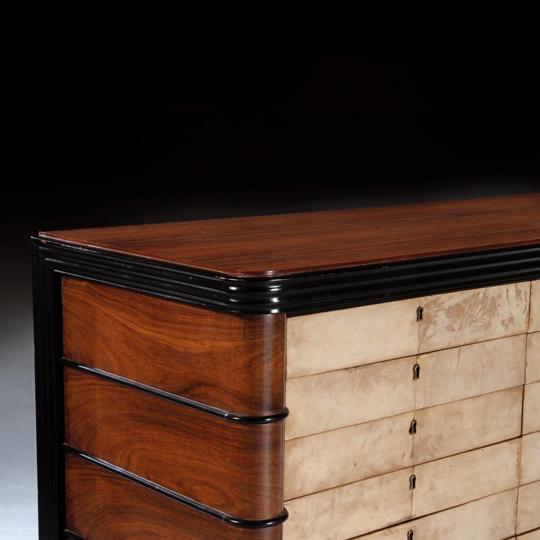 Art Deco Palisander Commode of Unusual Form With Parchment Covered Drawers