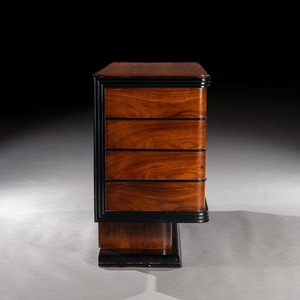 This piece dates to the 1930s and is therefore an early piece of Art Deco furniture with evidence of the new taste but with the rounded lines also looking back to classic pieces of the 19th century for inspiration. The use of parchment in combination with palisander is quirky and luxurious and recalls the work of the great designer Jean Pascaud who used precisely this same combination on a number of commodes produced in Paris in the 1930s and 1940s. Although a firm attribution is not possible, the present piece is certainly of the level of quality associated with Pascaud and would have been produced in a major French workshop of the period combining the latest manufacturing techniques with classic materials. The commode exudes luxury and fine proportion in equal measures.