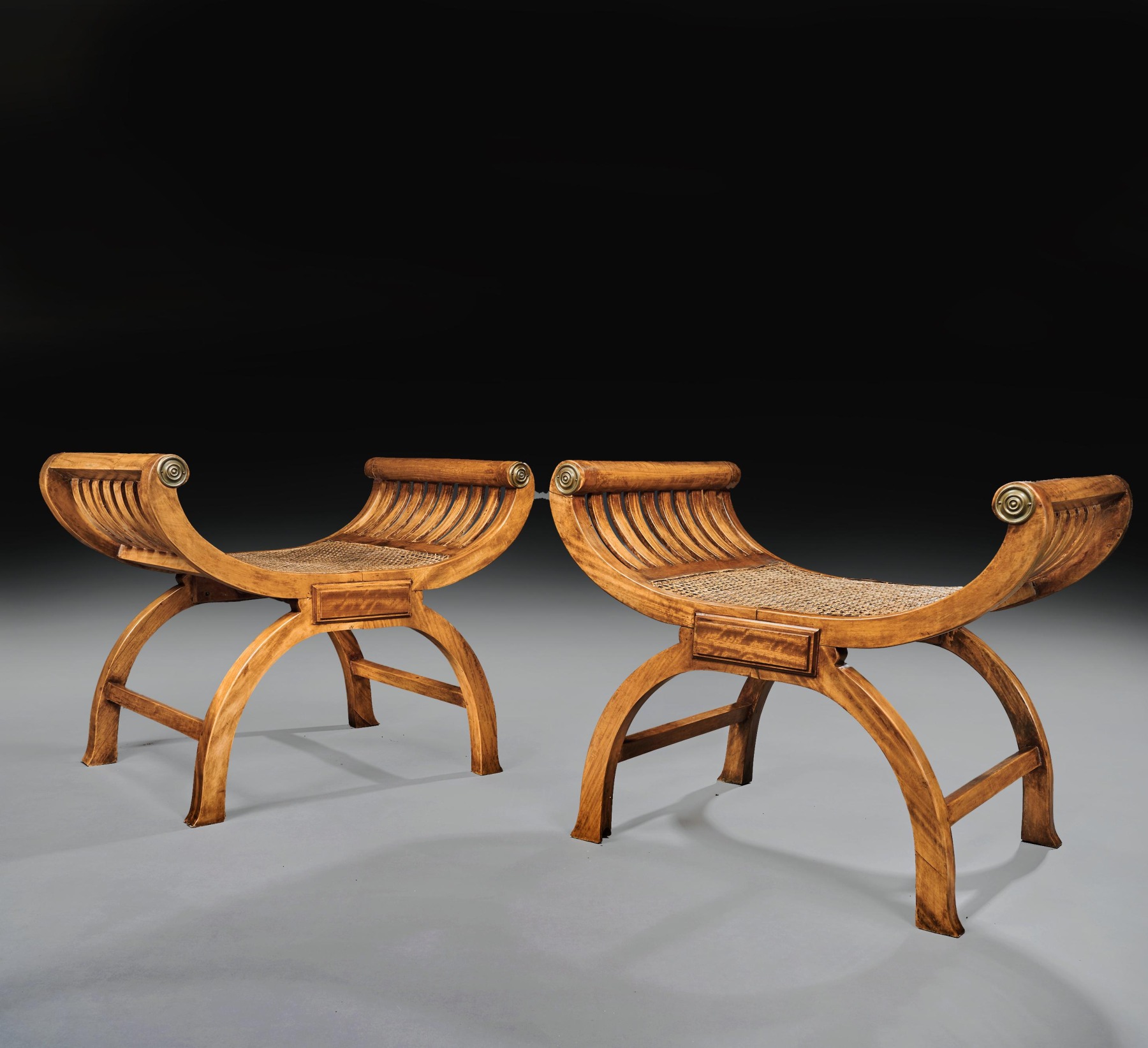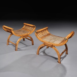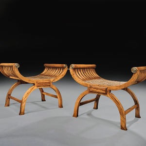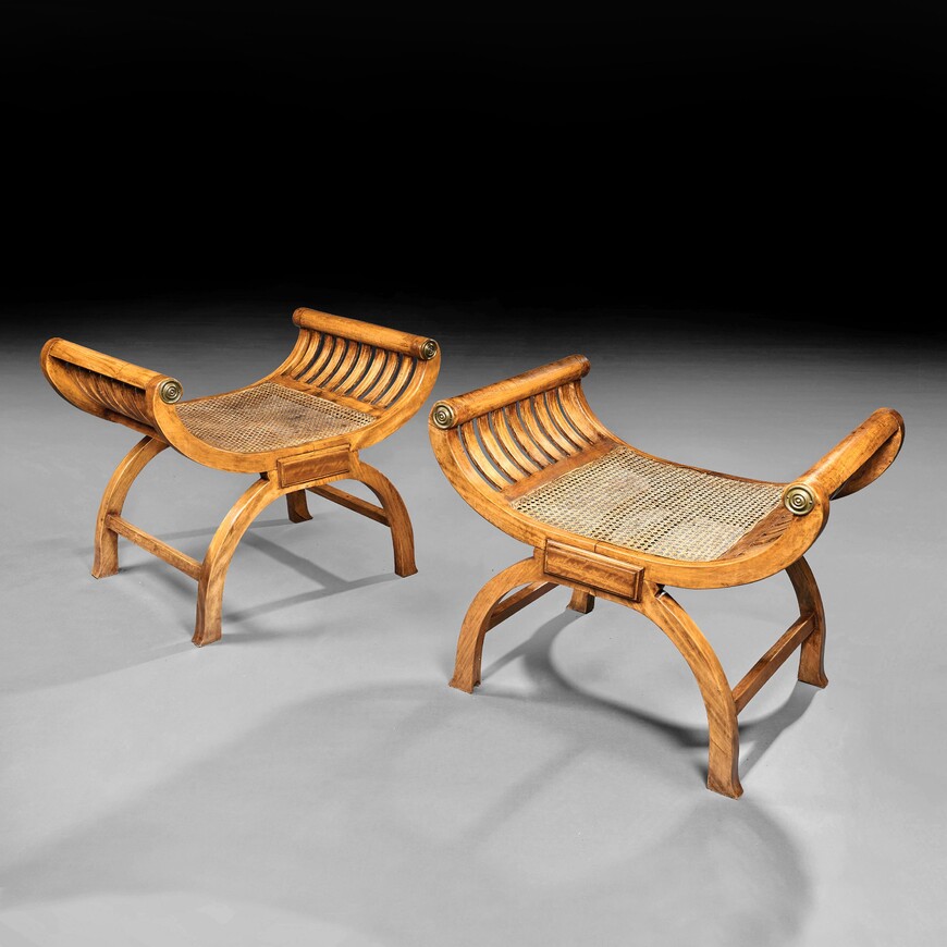 A rare and fine quality pair of British Colonial solid satinwood curule shaped window seats of large proportions dating to circa 1870.
